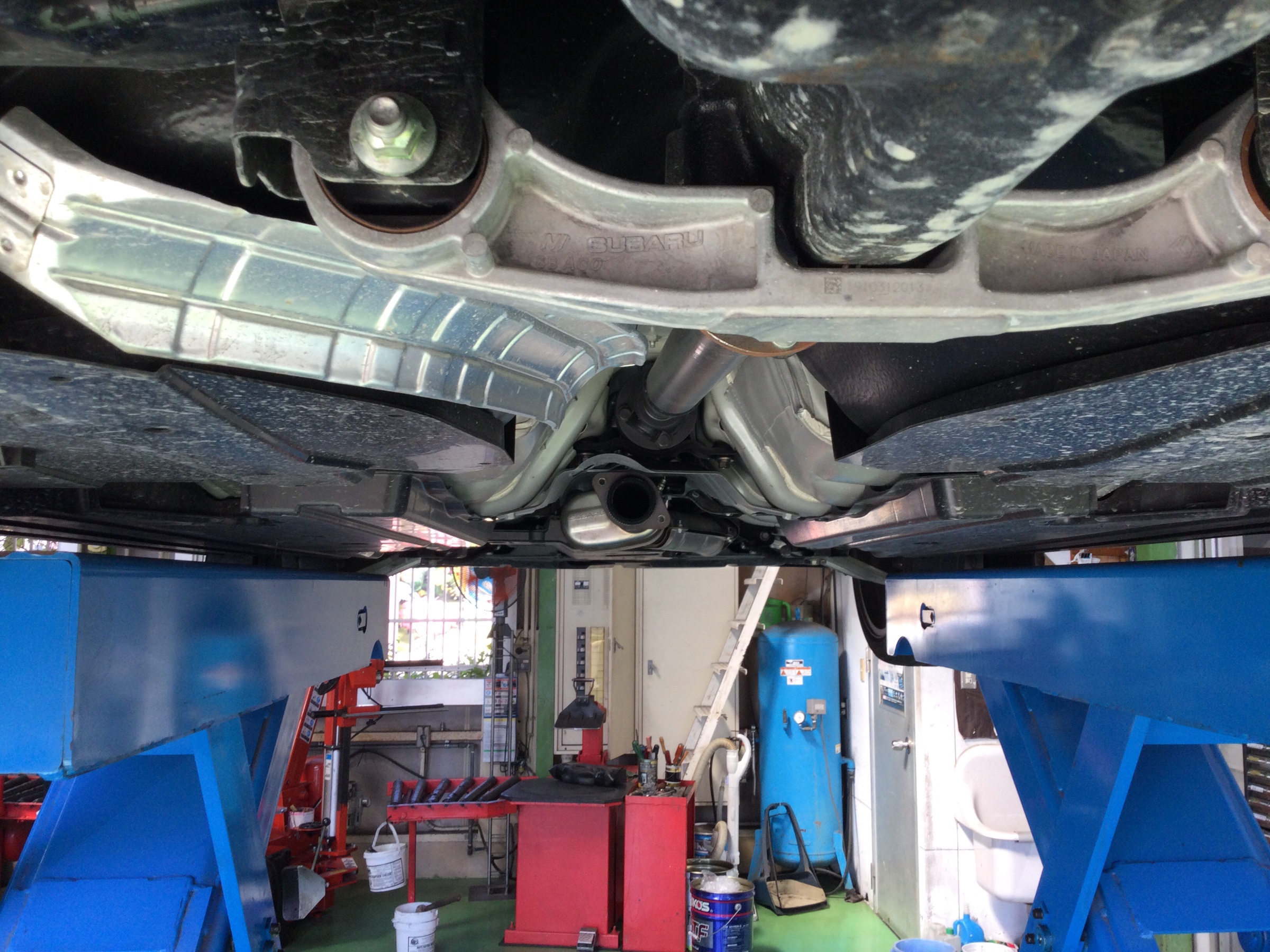 ノーマルマフラー。中間パイプ、リアピースを繋いでいるボルト、ナットを外していきます。