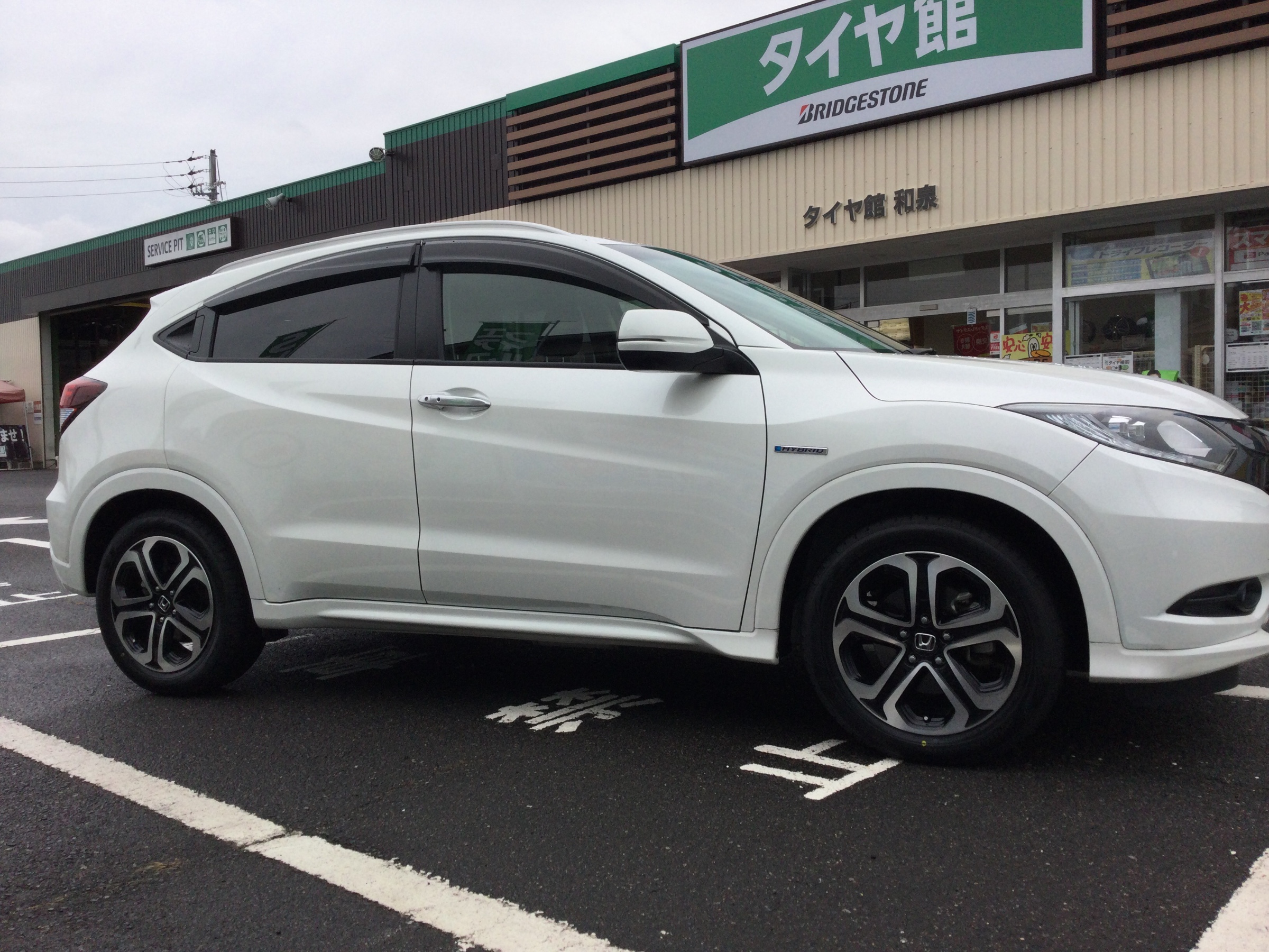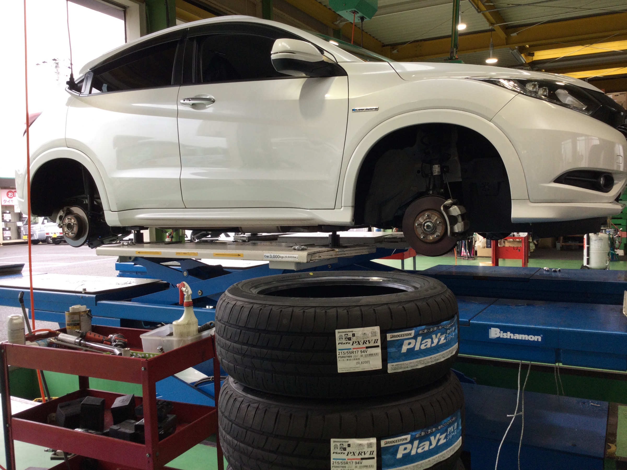 今日は、ご予約頂いておりましたヴェゼルHVのタイヤ交換です。