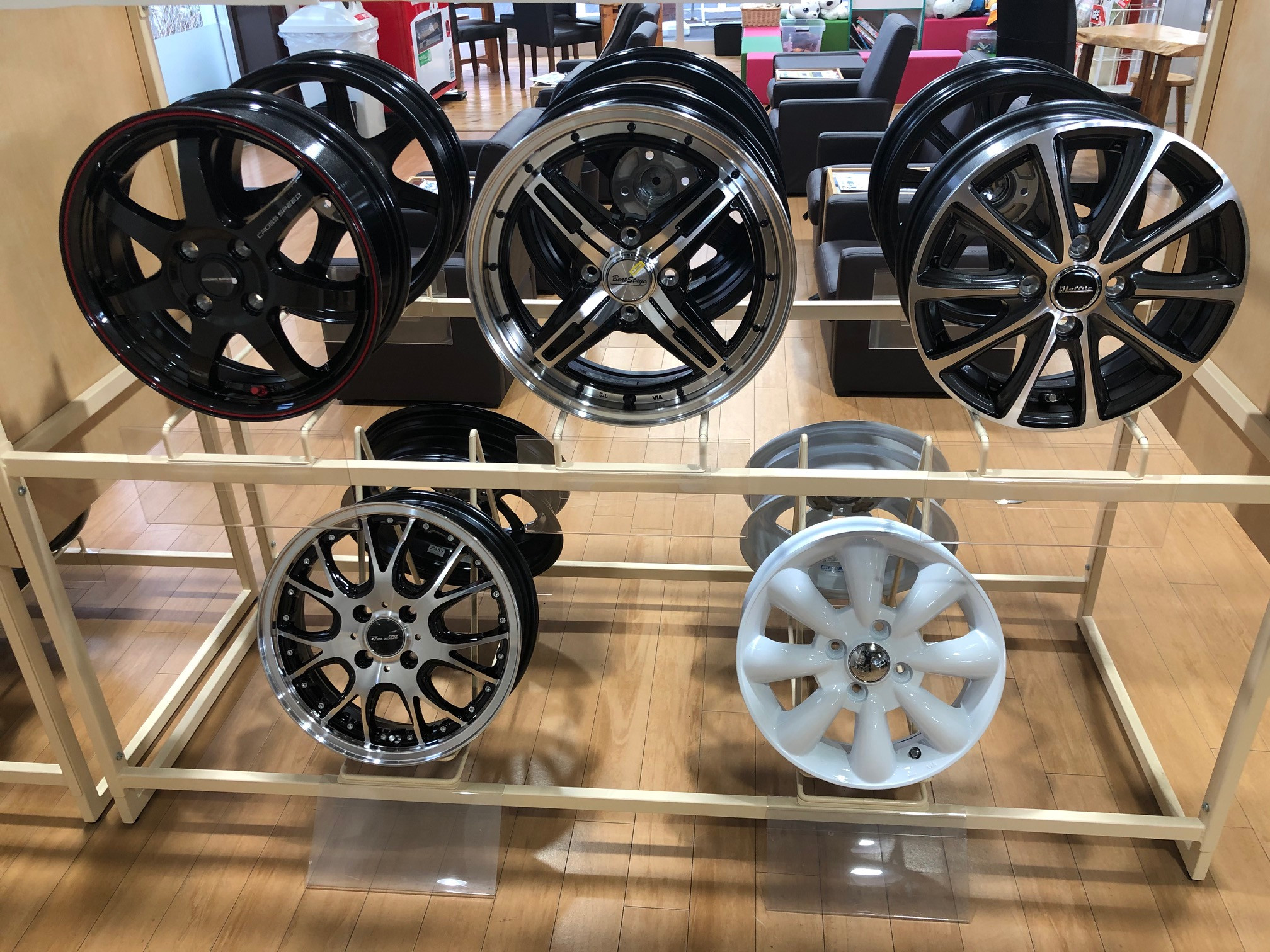 軽カーの14~15インチがメインですが、カワイイ系からスポーツ、渋めなデザインのホイールまで展示しております!