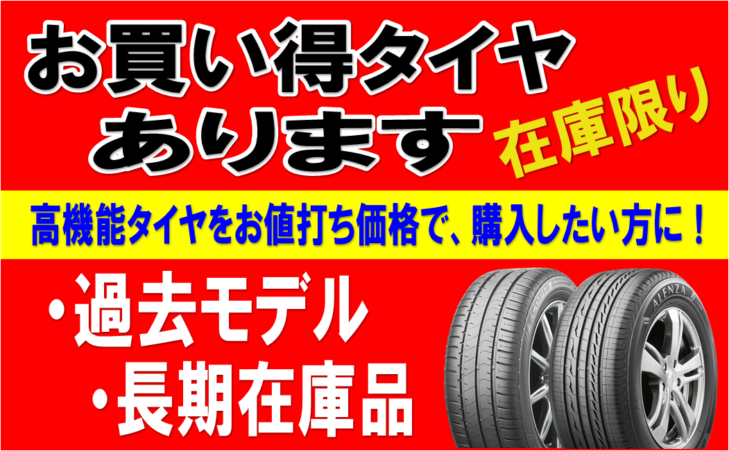 アウトレットタイヤあります!! ポスト 2026年2月13日 高性能タイヤをお手頃な価格で購入するなら、アウトレットタイヤがオススメ! 春は新商品の季節、廃盤になったモデルや長期在庫の現行品をお値打ち価格で販売中です。 在庫品限りとなりますので、ご興味のあるかたは早めのご来店をお勧めします。 担当の一押しはSUV専用高機能タイヤ「ALENZA LX100」がオススメですね。 まだスタッドレスを装着中の方も春に向けて早めの準備をしては如何でしょうか? カテゴリ:タイヤ関連 担当:今井
