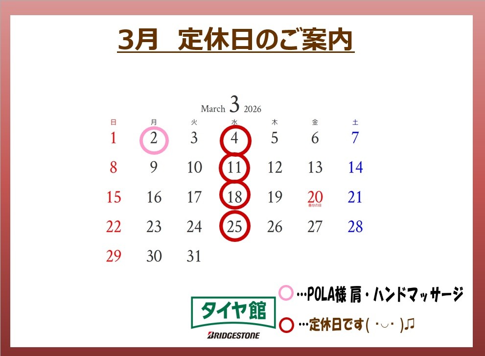 タイヤの無料点検実施中 !ひび割れ・残り溝・空気圧など4本しっかり点検します!