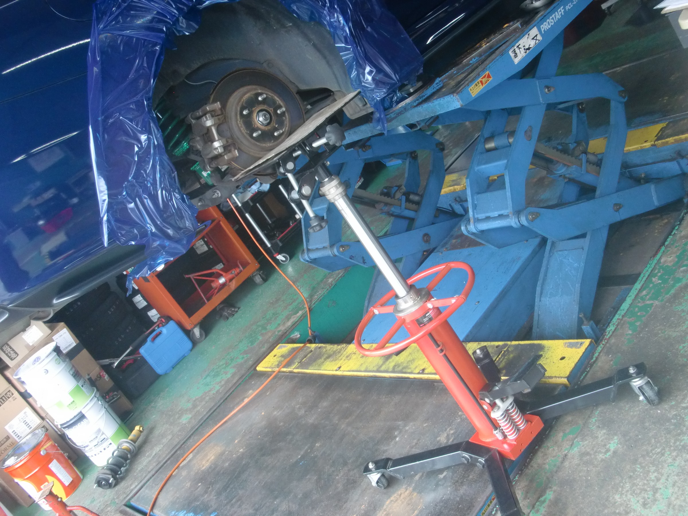 車高調を装着したら、ミッションジャッキを使用して足回りのブッシュに1Gの荷重をかけてから緩め&締め直し!