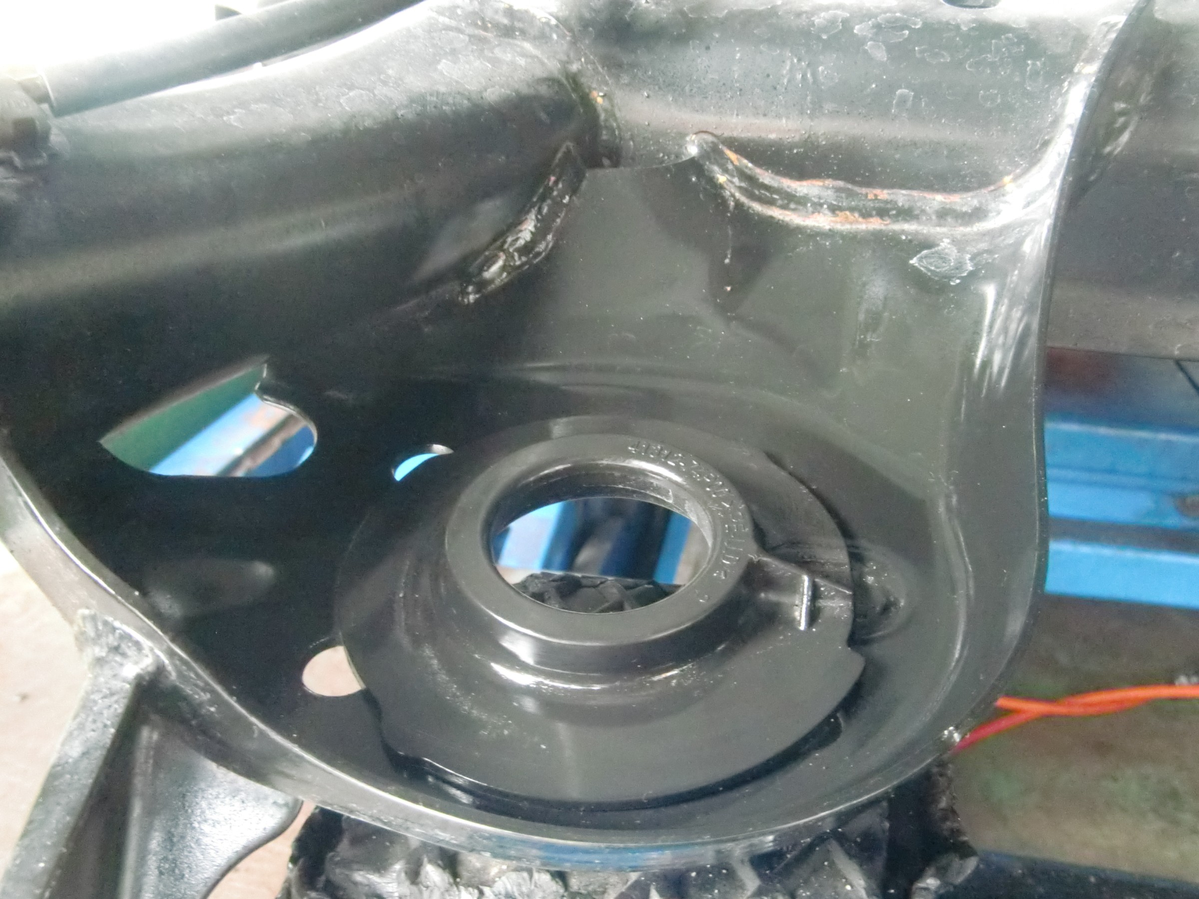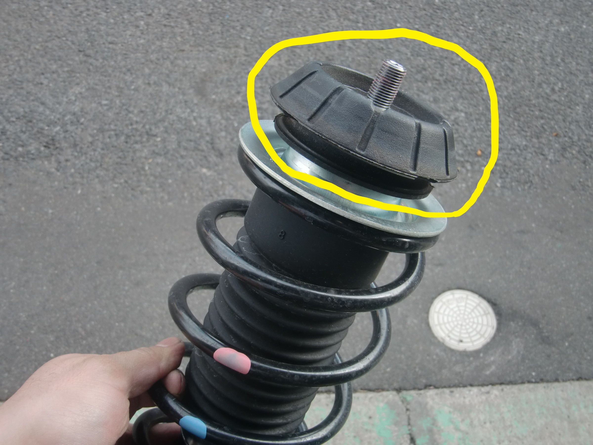 外したら、黄色い丸の部分のアッパーマウントやベアリングなどを外して、車高調に移植します!