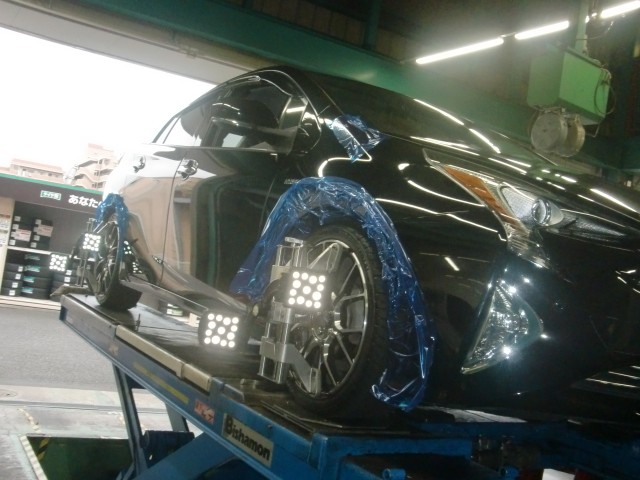 サスペンション交換を行うと必ずタイヤの角度にズレが生じるので、そこをしっかり修正しないとタイヤが変な減り方をしたり、ハンドルのセンター位置が大幅にズレたりするのでしっかりアライメント調整で補正させていただきました!