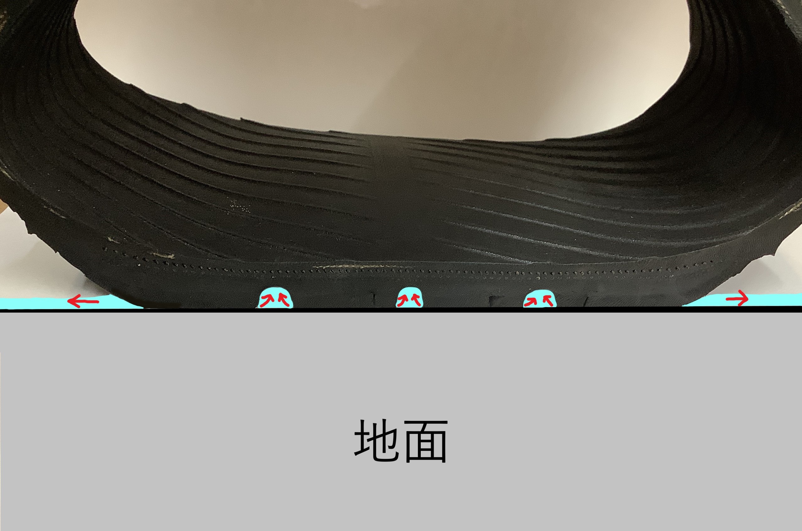 このようにしっかりと溝があれば水たまりをかき分けて進めますし、ミゾの隙間に水の逃げ道が確保されることでタイヤが地面に密着しやすくなり、そのままタイヤの回転で後方に排出してくれますので安全に走行できます(σ゚∀゚)σ