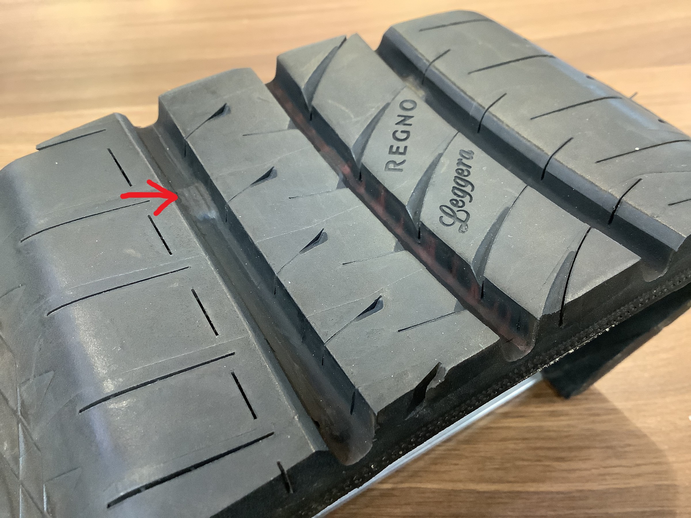 これが地面に接触するぐらい縦溝が減ると“残り溝が1.6mm”という使用限界で、雨天での水捌けの安全性が確保できない為に整備不良となり道路交通法違反ですし車検にも通りません!