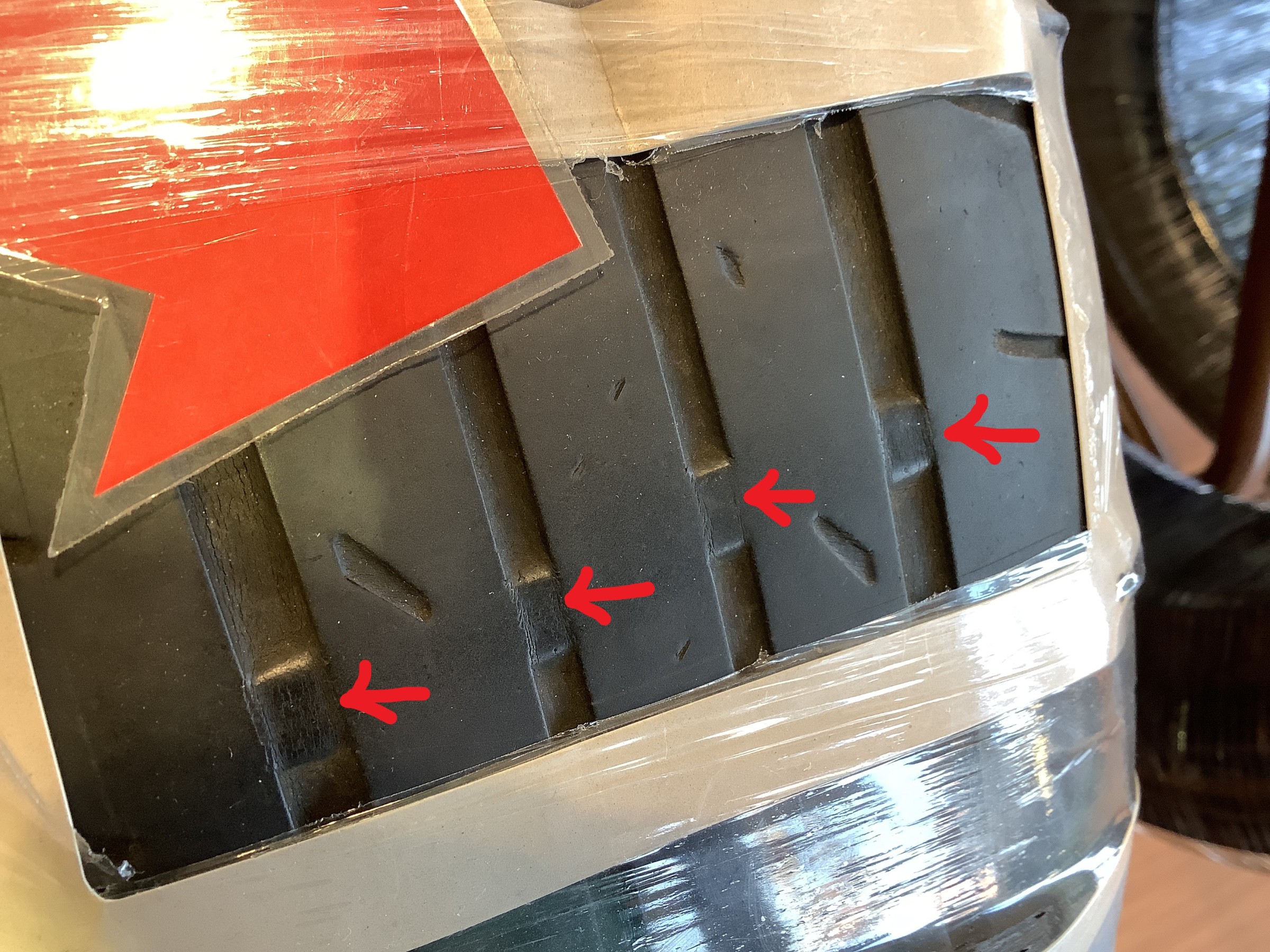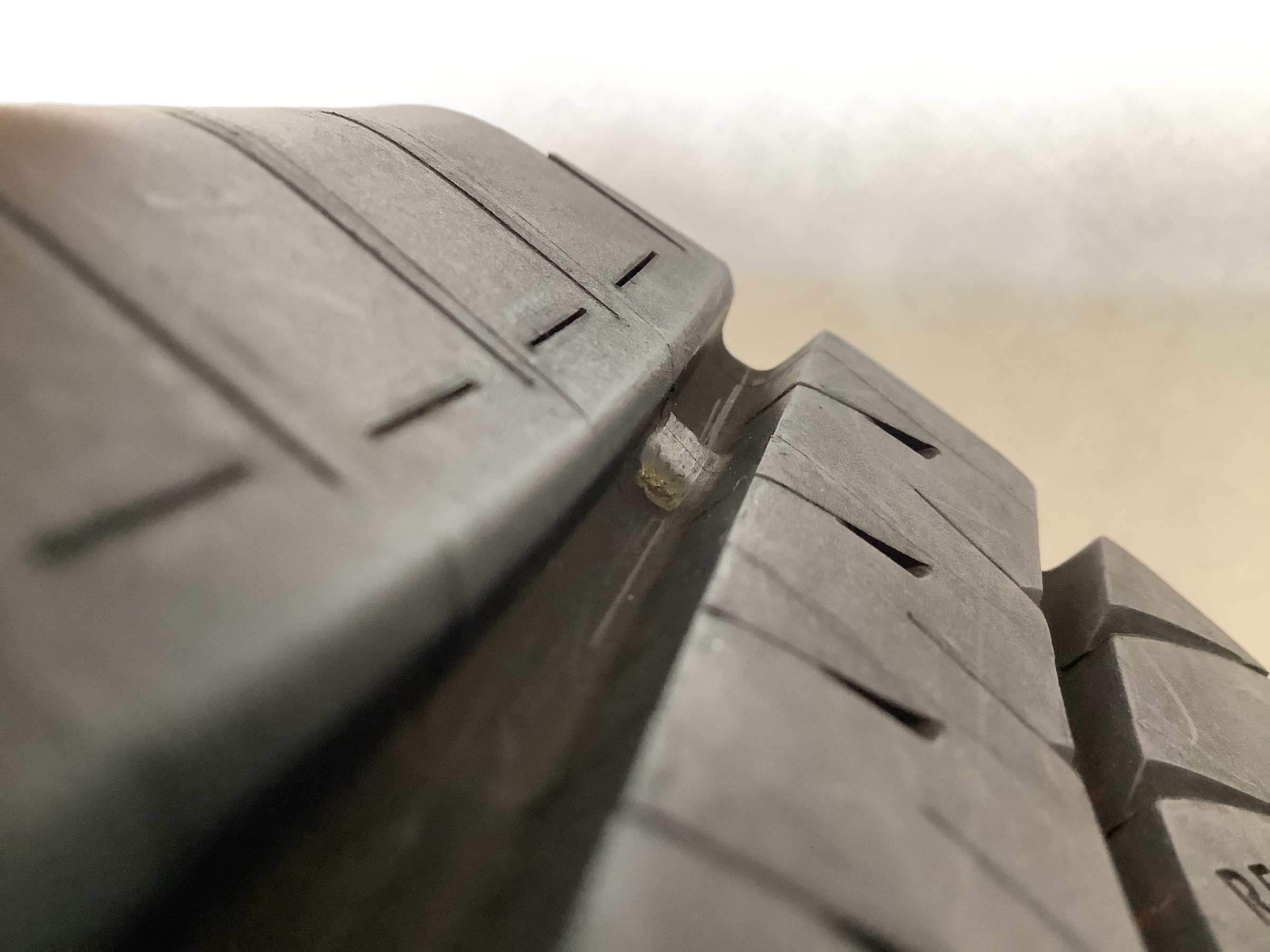 ちなみにタイヤのストレートグルーブ(縦溝)には限界値を表す印がついていて、それが矢印部にある“スリップサイン”という小さい出っ張り!