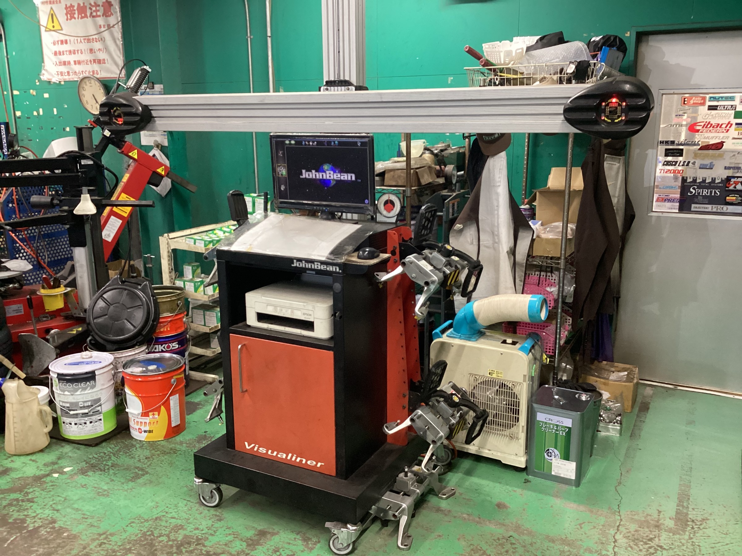 ホイール4か所にセンサーを取り付け、状を確認した上でおクルマ1台1台に決められたデータをもとに主に以下の3つの角度を調整していきます。