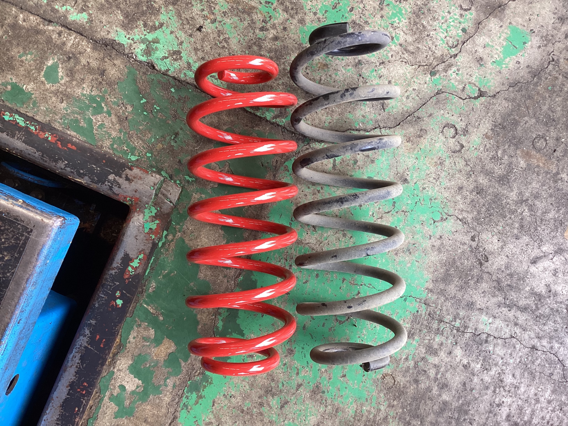 こちら、右がリアの純正スプリングで、左の赤いほうがリア用のNF210です。