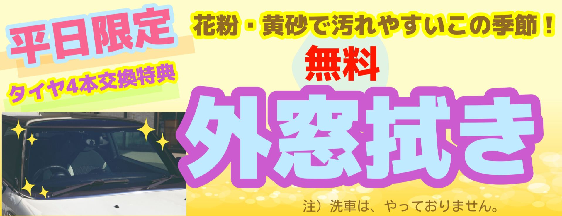 という事でタイヤ館おゆみ野では平日限定でタイヤ4本交換の方限定で外窓拭きあげます。