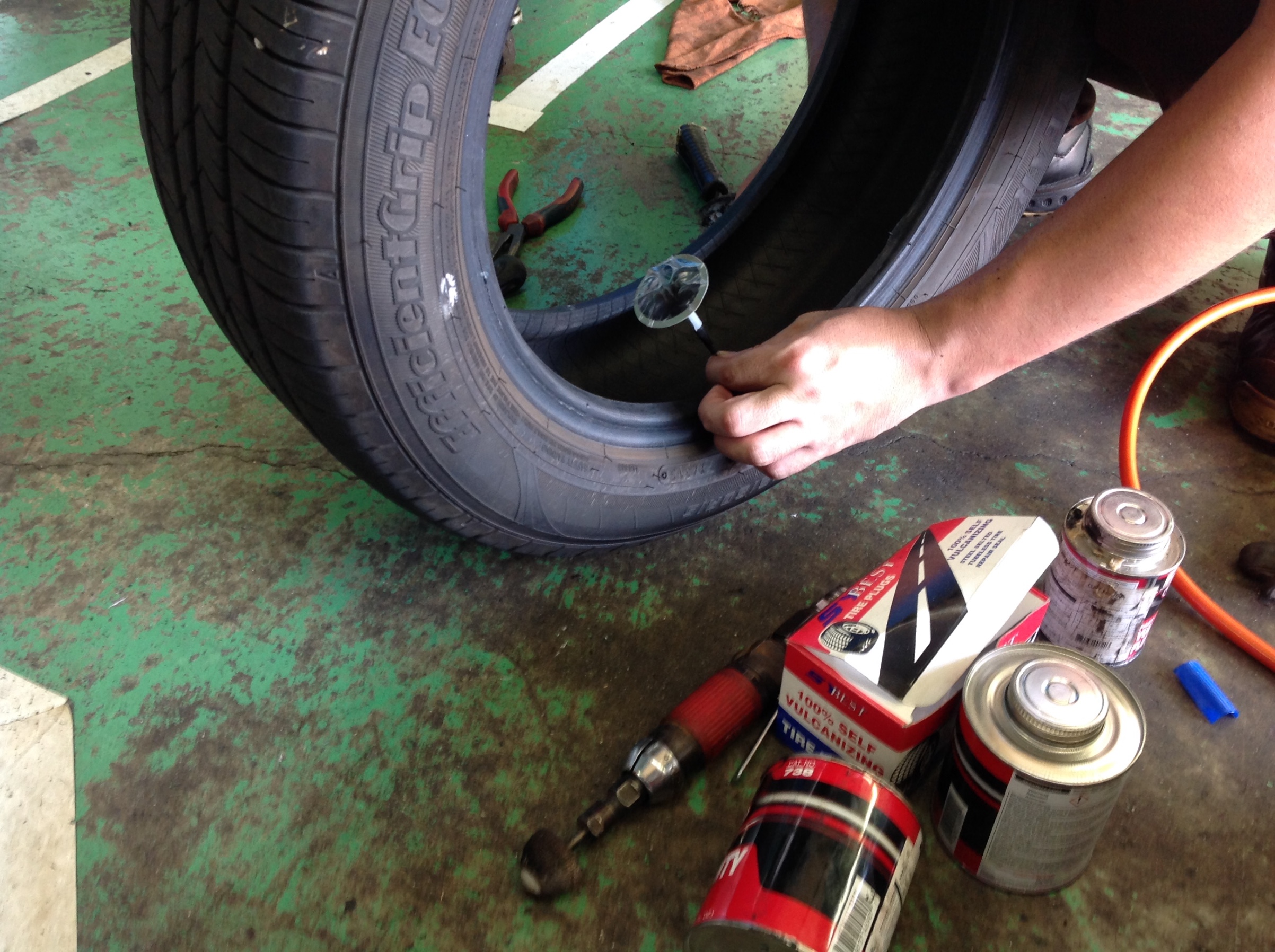 パンク内面修理の作業中です、色々な工具や、加硫セメント剤などを使用します。