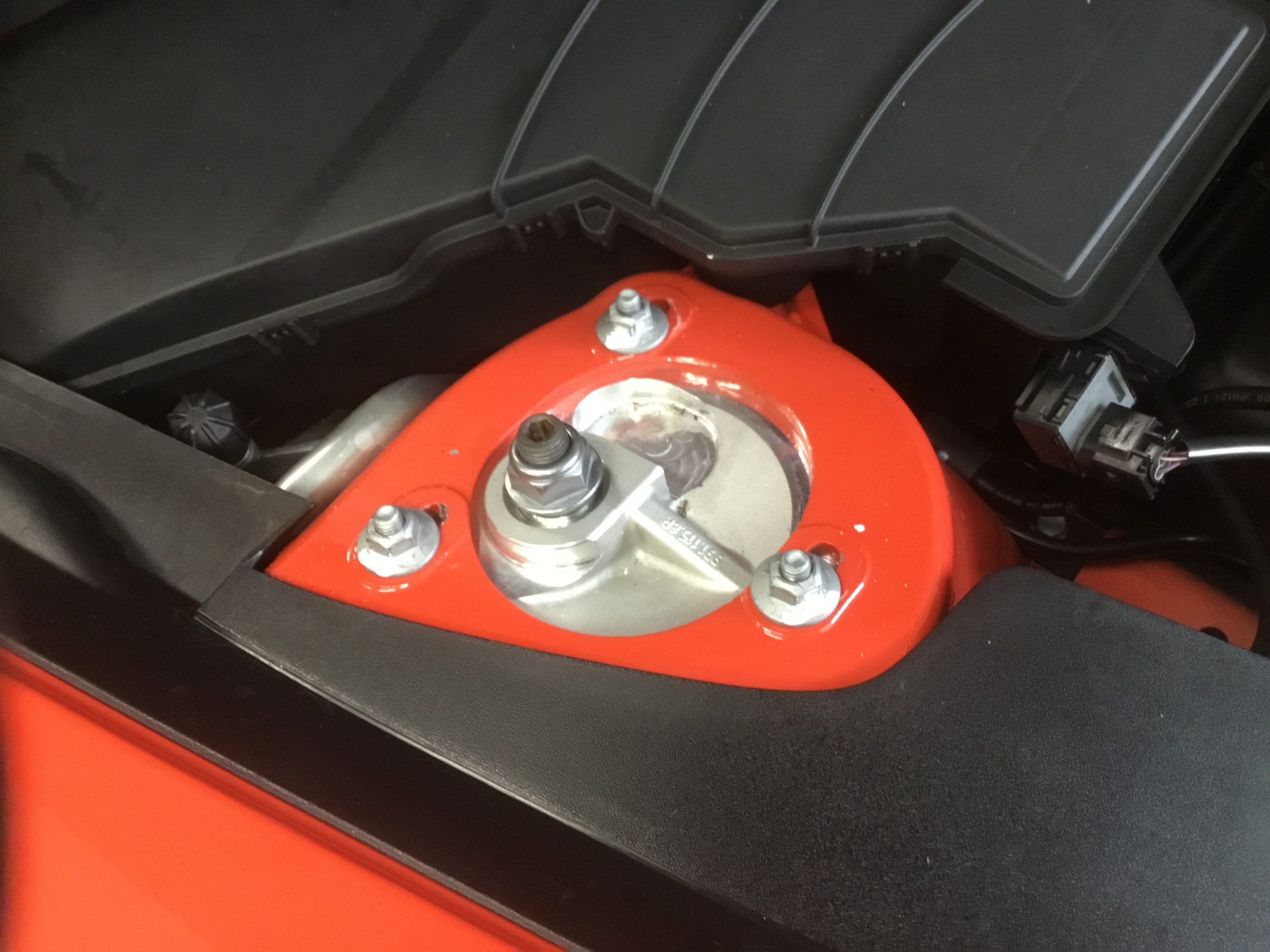 いつも通りのアッパーマウント付け根のボルト3つを緩めて調整する方法と、