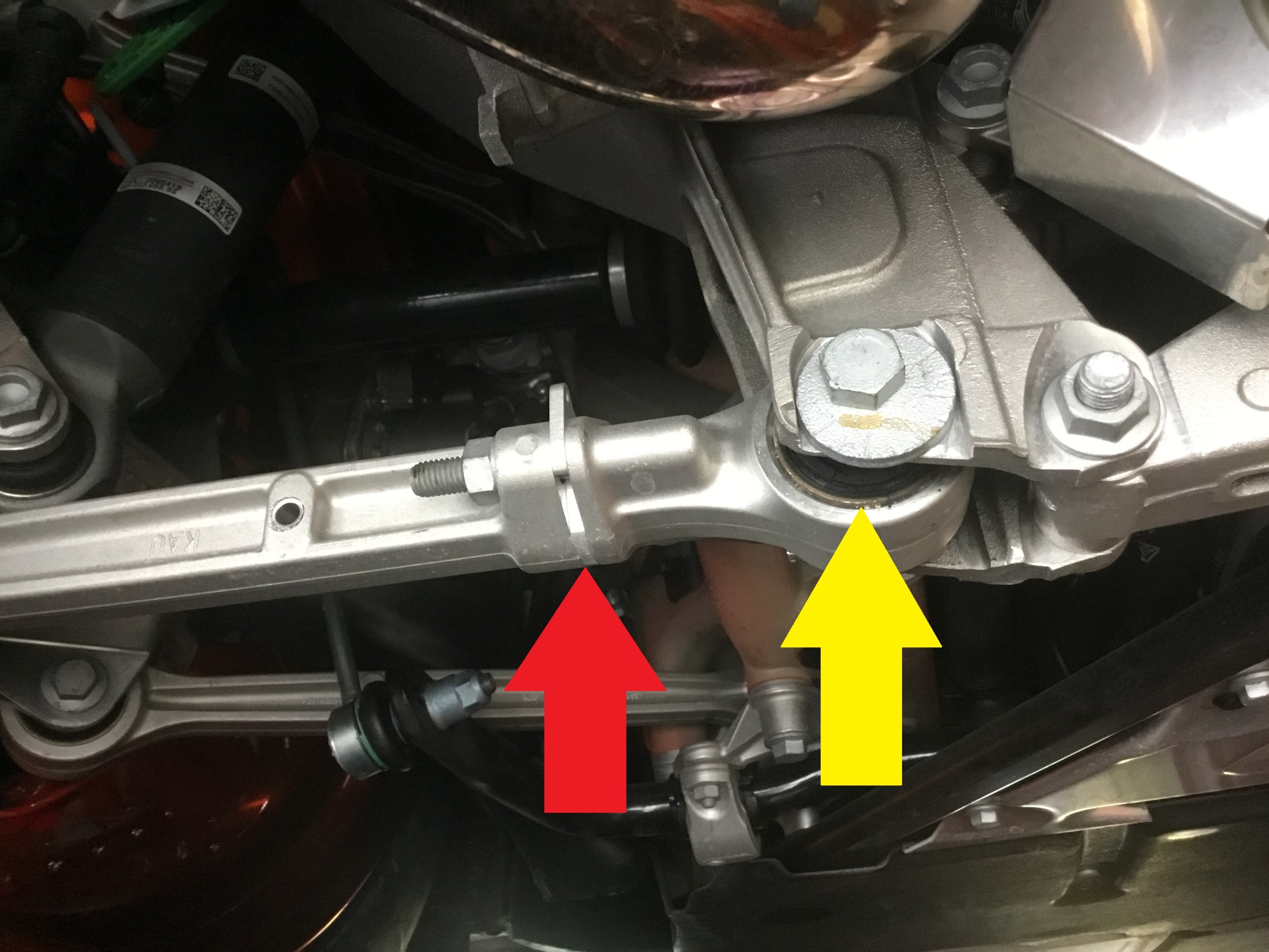 黄色い矢印のロアアーム付け根のカムと、赤い矢印のシムで調整できます。シムで調整する場合は、キャンバー調整用というよりもトレッドの調整用としての方が、ロアアームの長さが左右で変わらないので良いかもしれませんね。