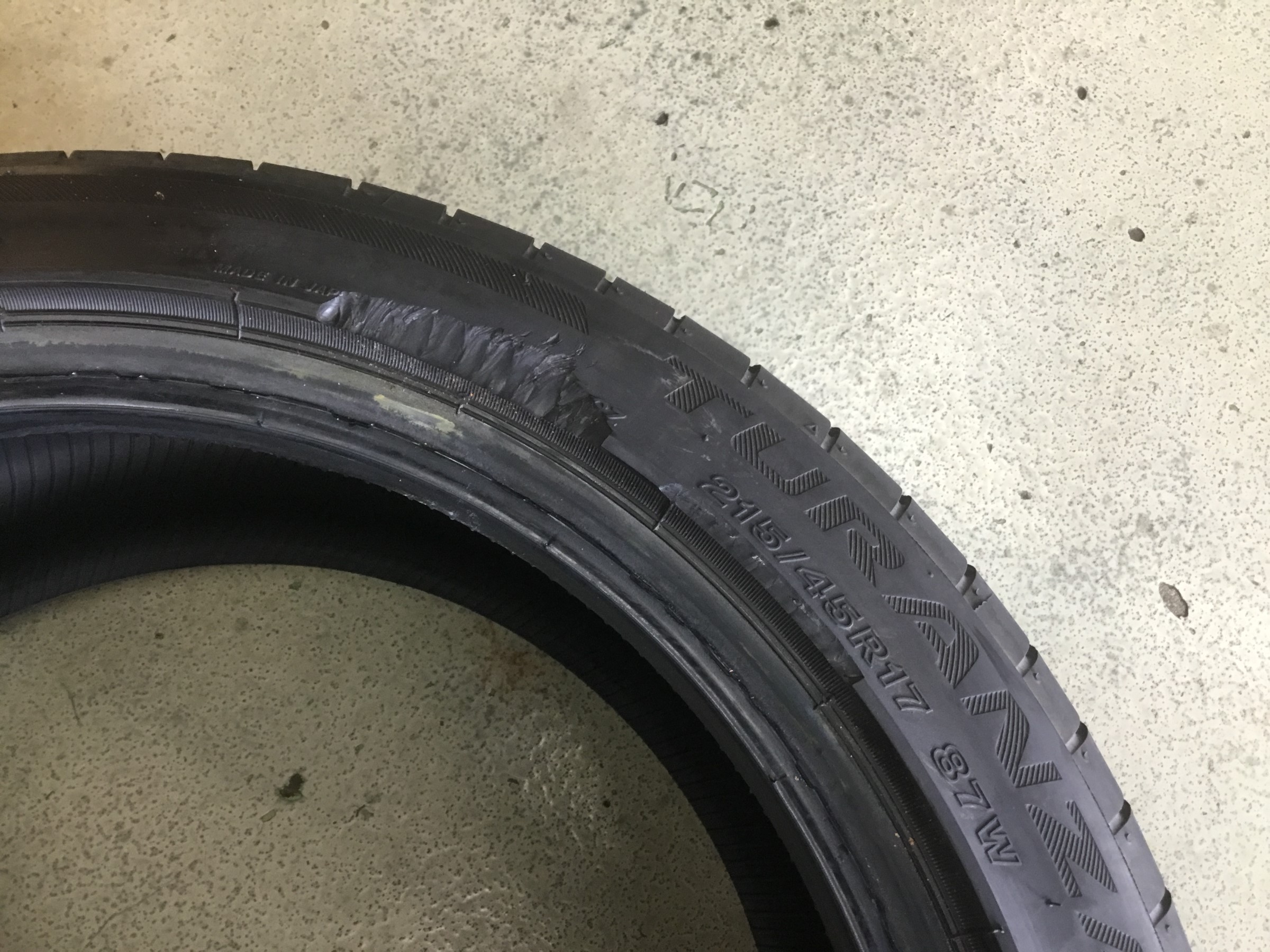 下の写真のようにタイヤに深い傷が付いてしまいました。