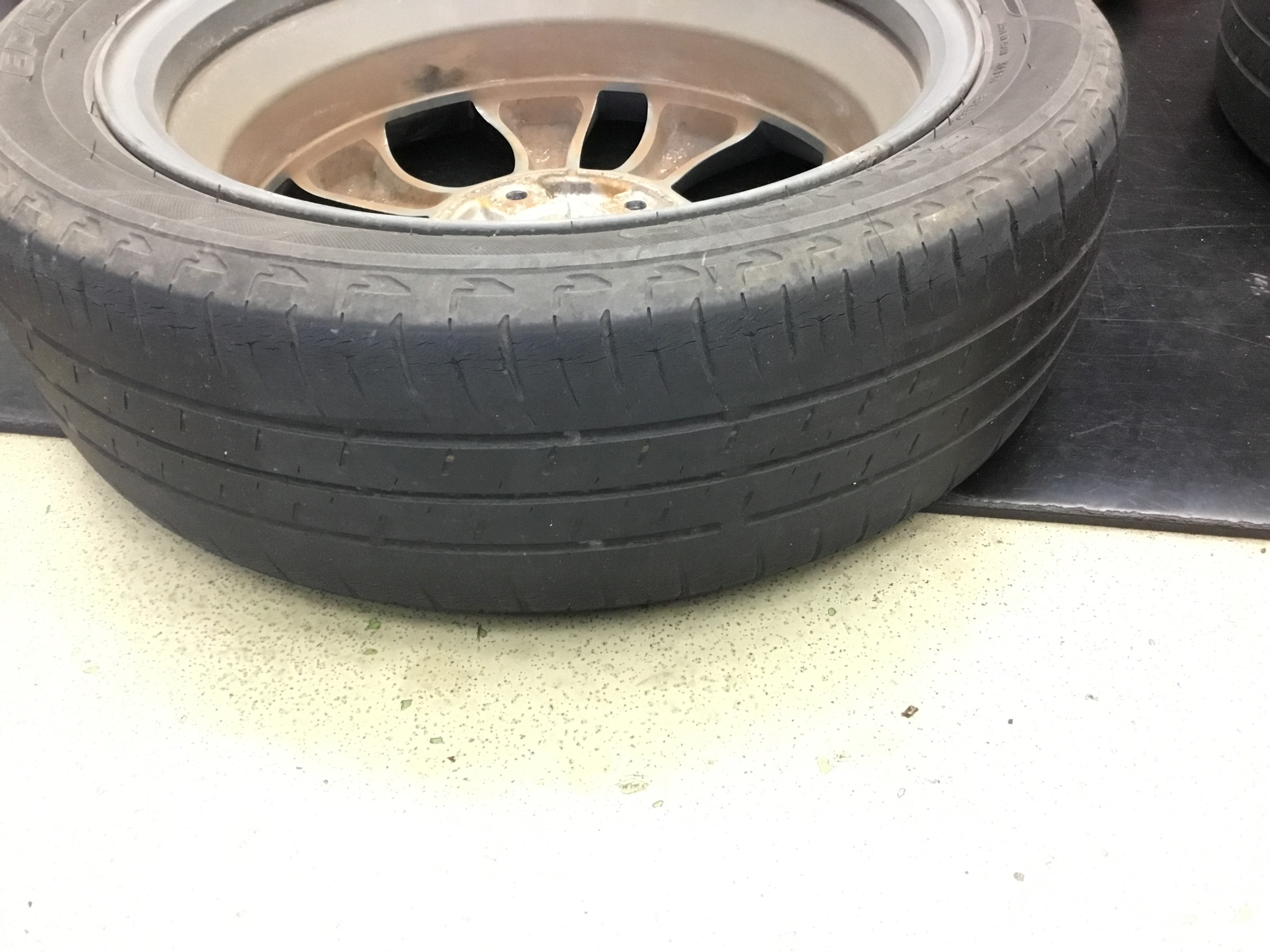 取り外したタイヤは溝が無いのは勿論の事、全体的にひび割れを起こしていました。