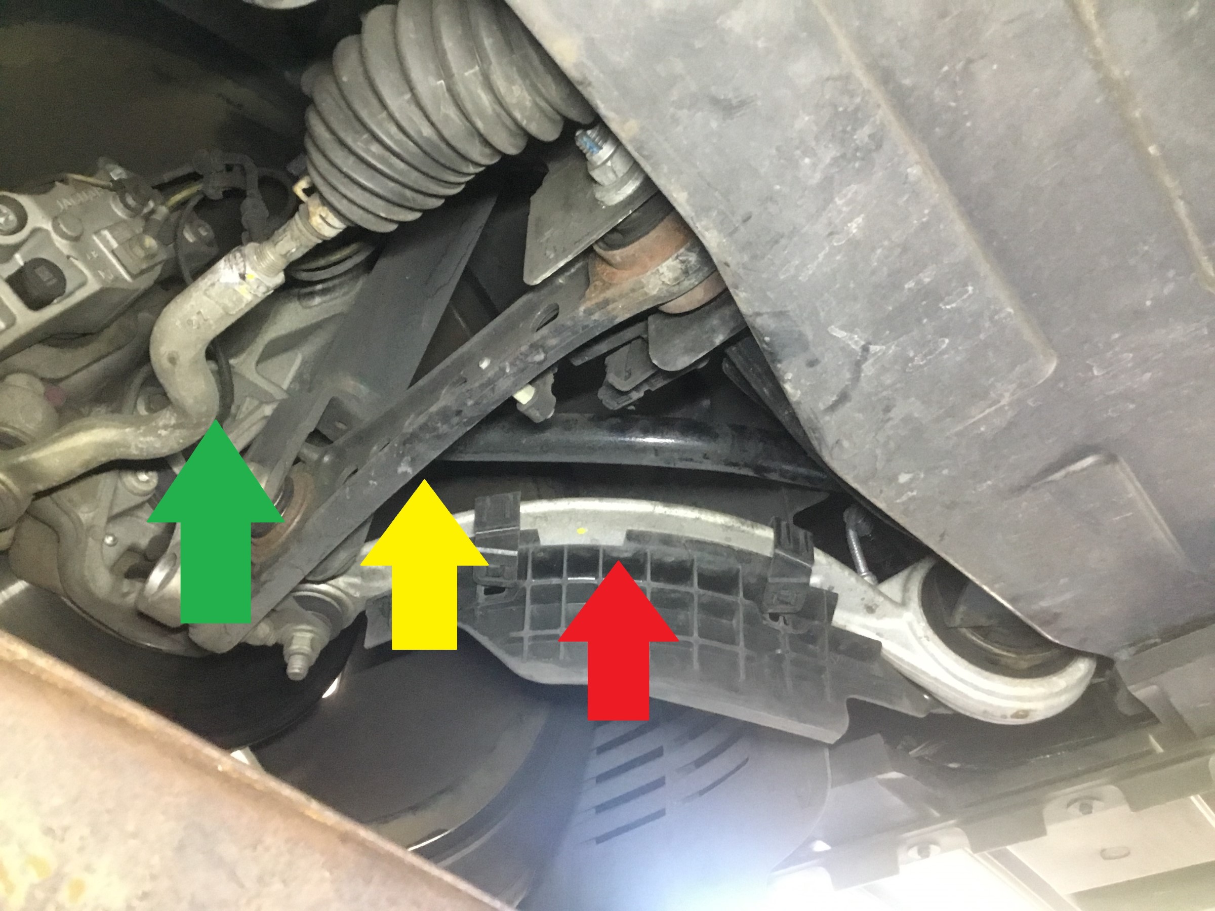 赤矢印がキャスター、黄色がキャンバー、緑がトーとなっています。Aアームのようにアーム全体が動く構造ではないので、独立して調整が可能となっています。