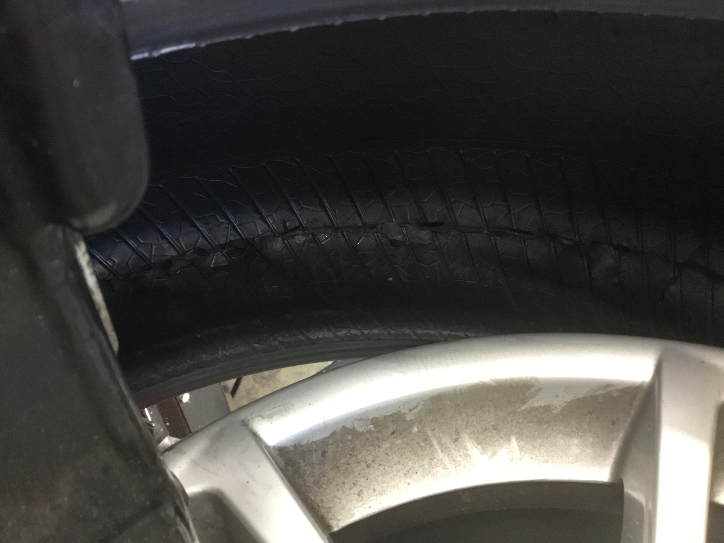 取り外したタイヤの裏側を見るとかなりの損傷が・・・。