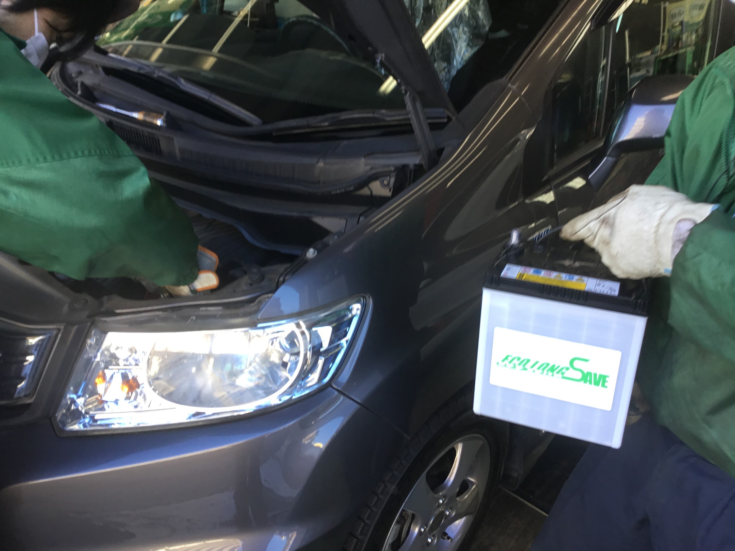 スタッドレスの履き替えでご来店されたフリード、安全点検からバッテリーとワイパーの交換です。