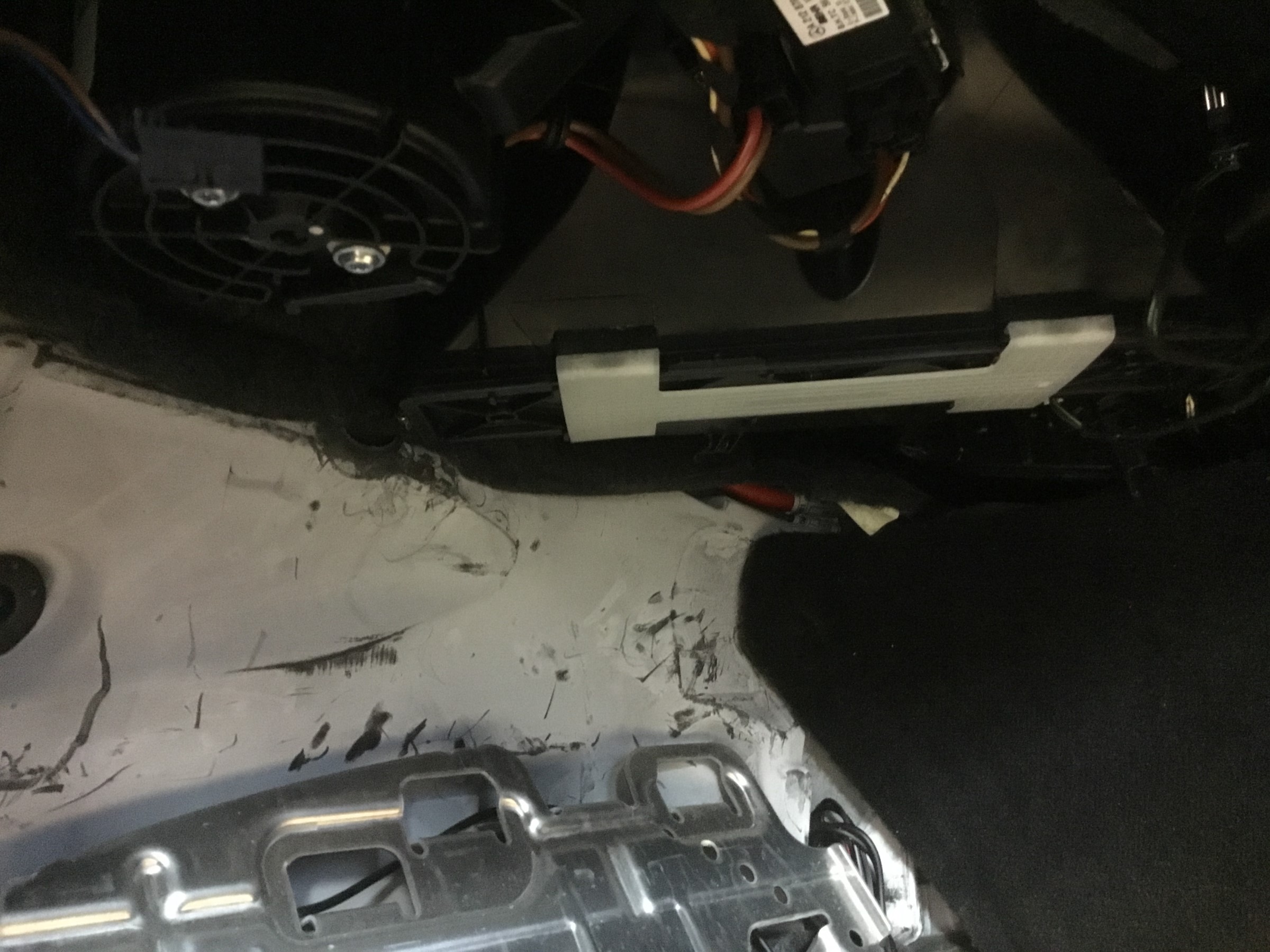 欧州車では多くの車両で助手席前グローブボックス下部のパネルを外して交換します。このW218も例には漏れず、グローブボックス下部にありました。上の写真の白いH型のパーツをスライドさせて取り出します。