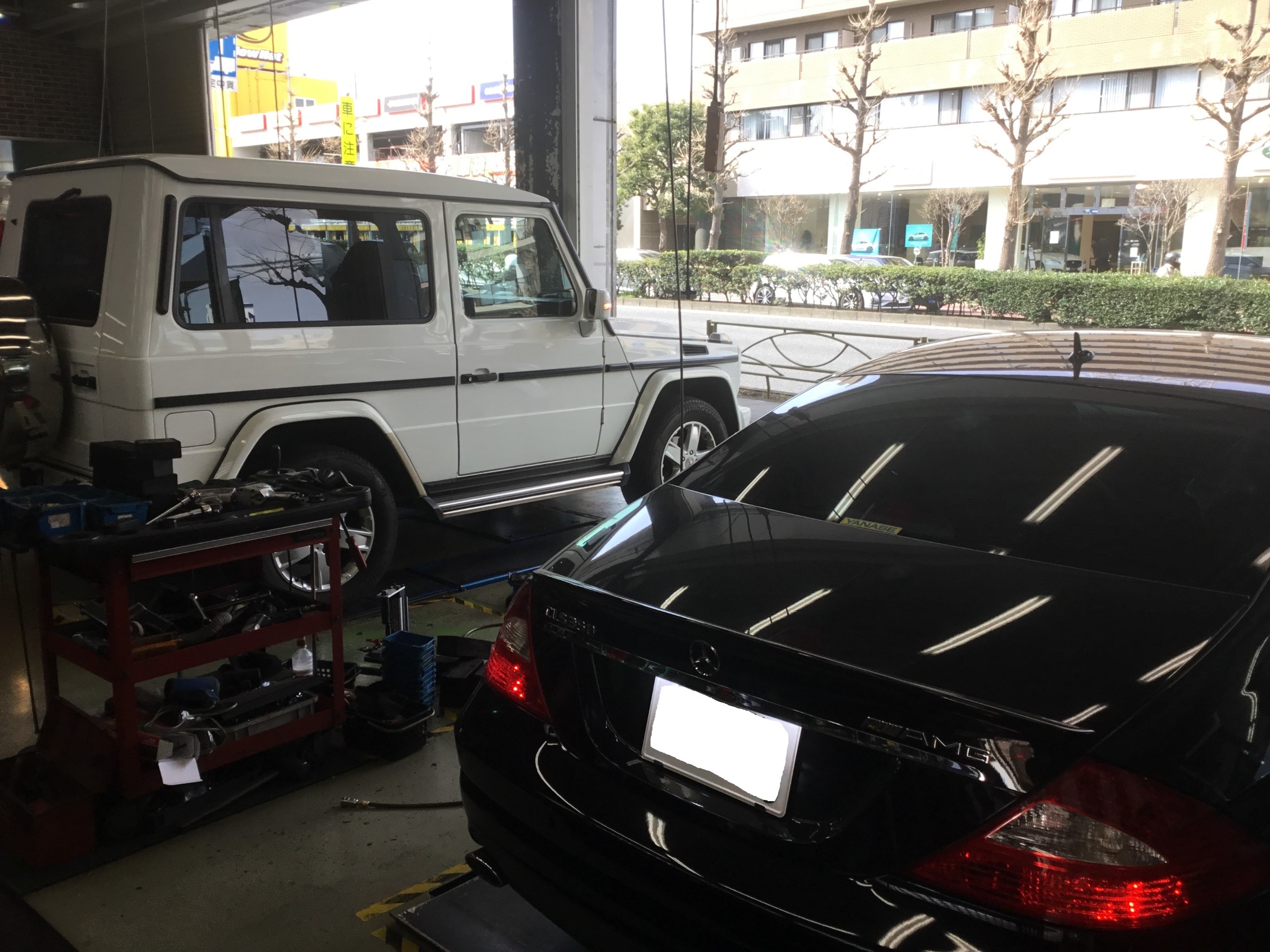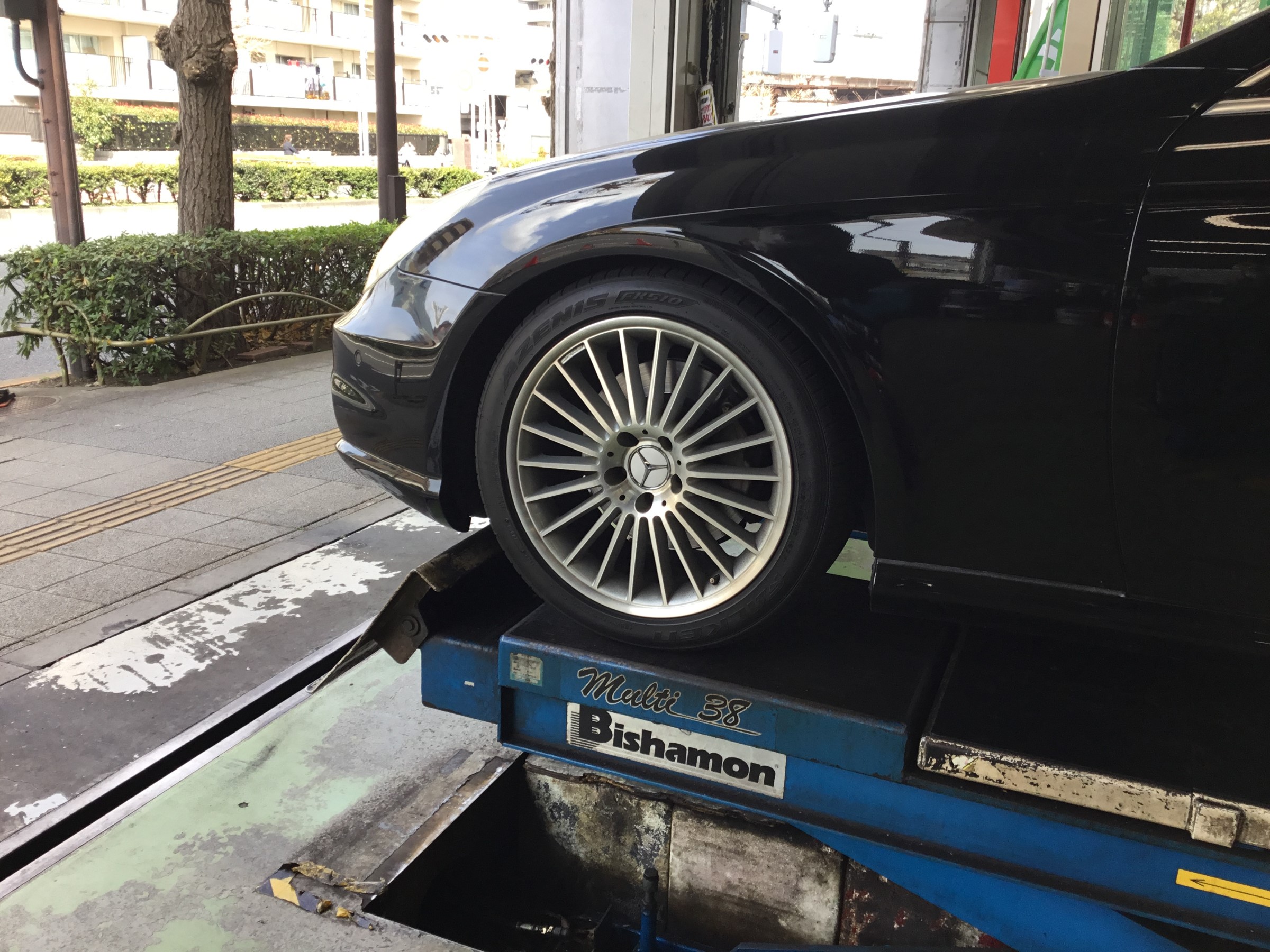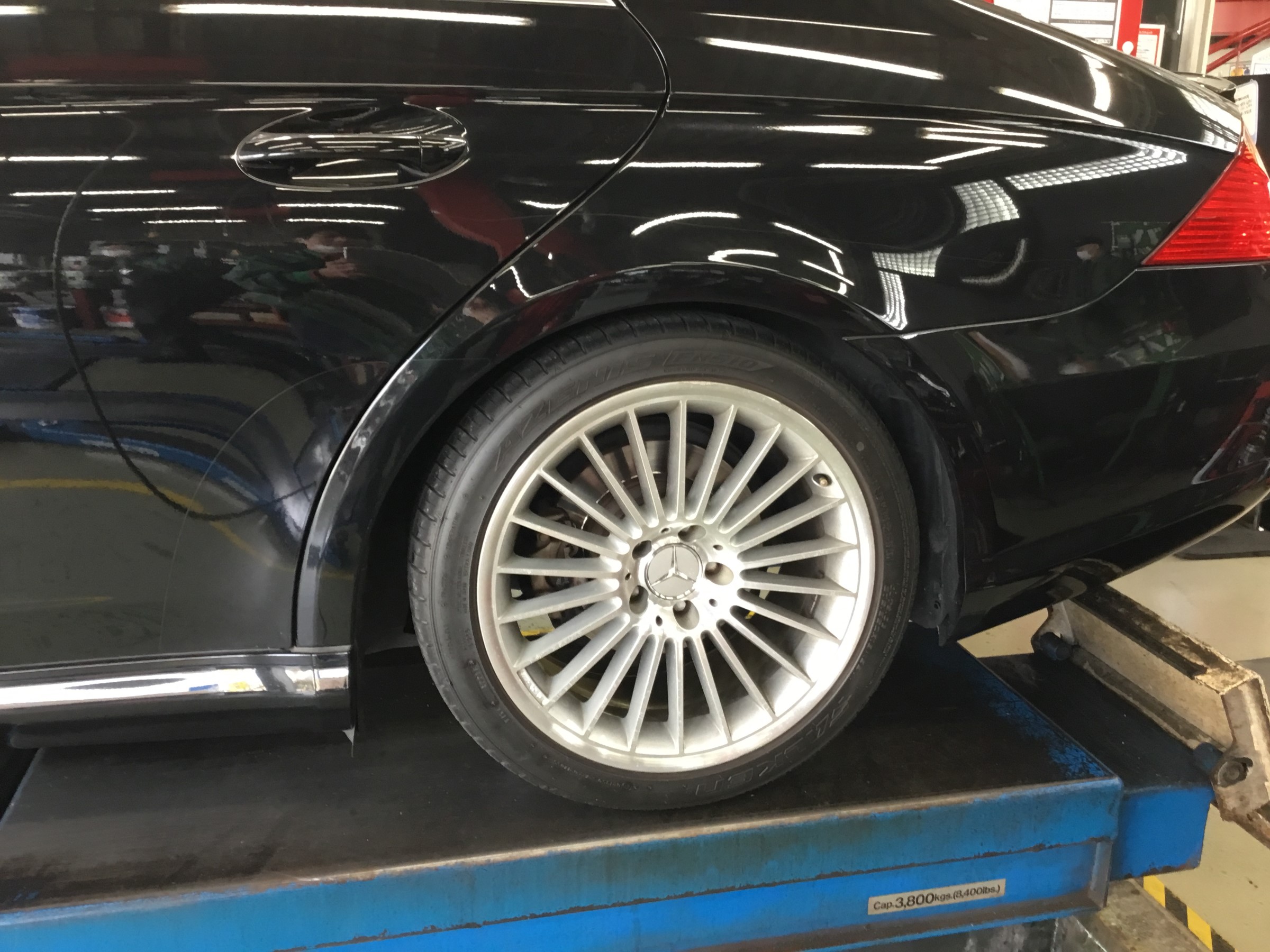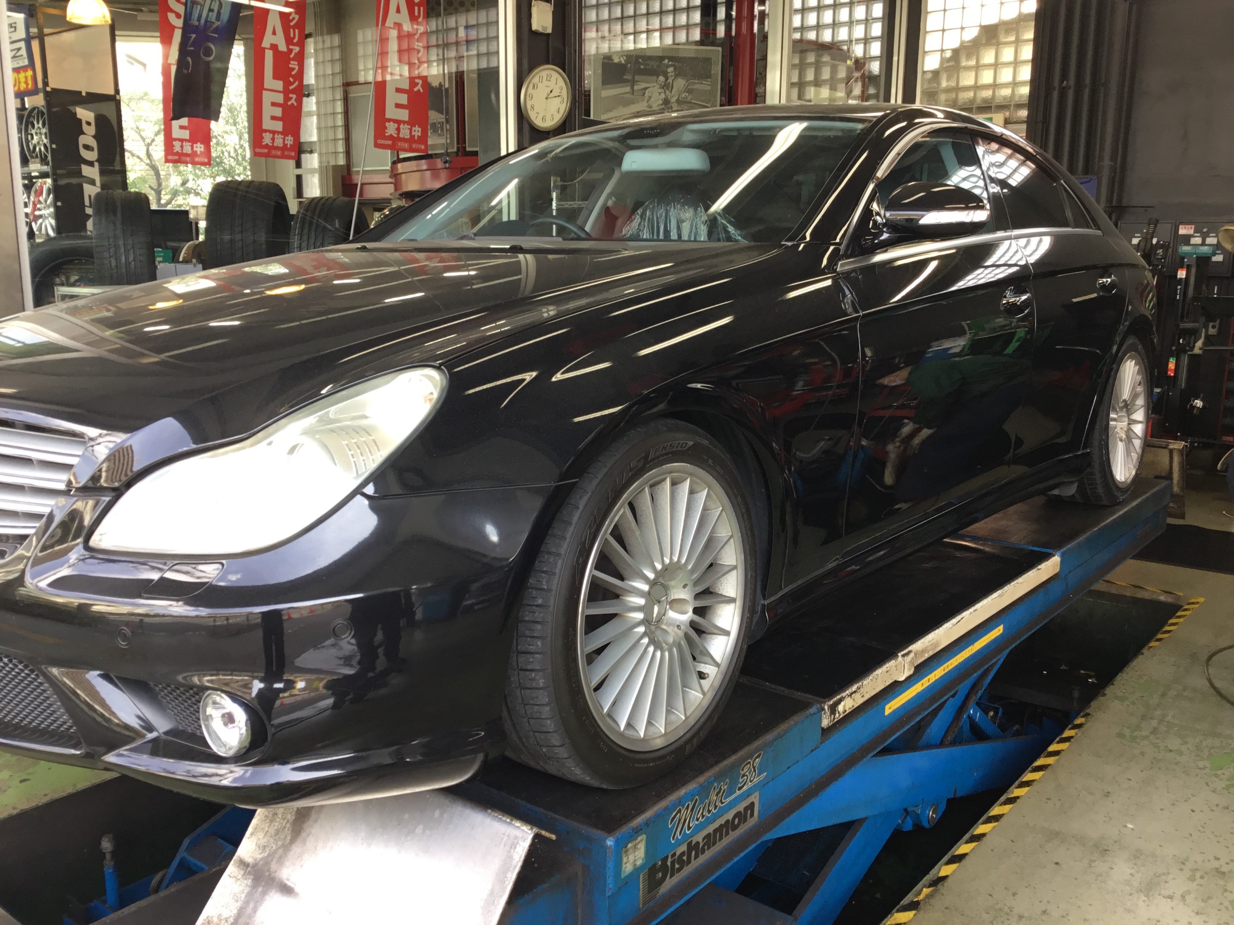 本日、CLS350エアサス車への車高ダウンを実施致しました。