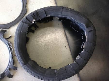 この現象、業界用語で「ブリーディングCBU」というんですが、極端な低空気圧による走行が原因で、タイヤサイド部のカーカスコードが切断する損傷のことなんです。