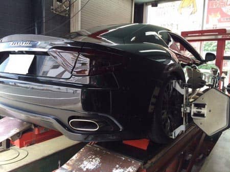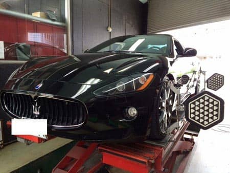 画像1・2 マセラティ グラントゥーリズモアライメント中♪とにかく車高が低すぎて入庫が大変過ぎました。。 フロントはメーカー基準に準ずることなくトーインで調整ッ!
