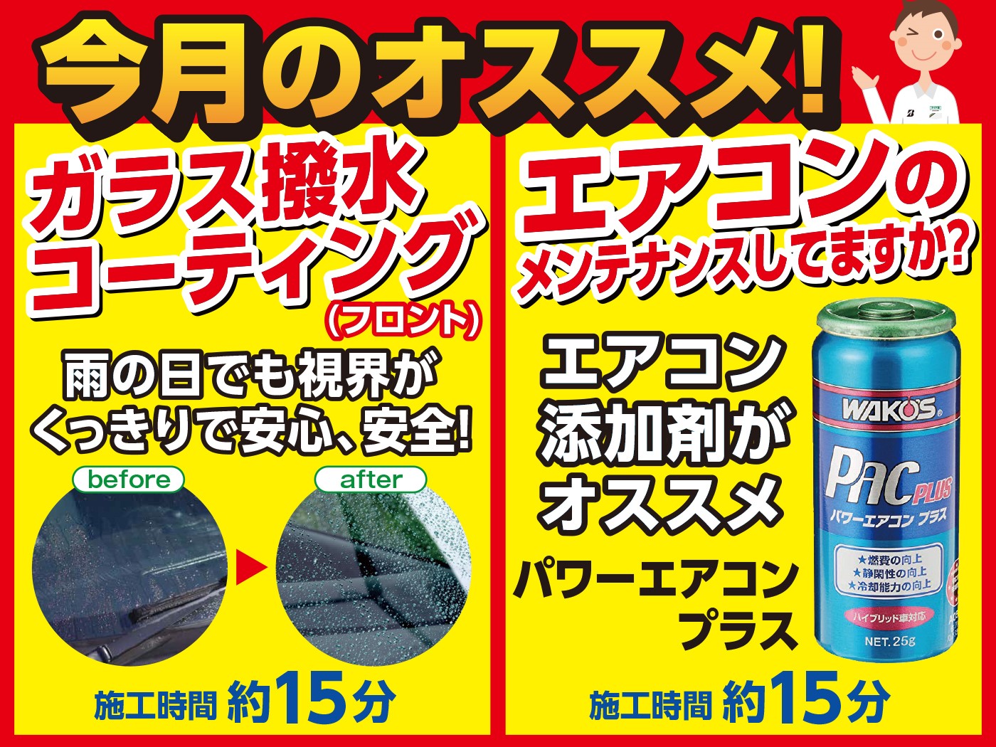 今月は、ガラスの撥水コーティングと、エアコンガス添加剤です!!