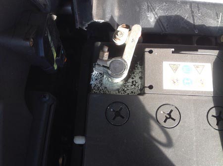 バッテリーのターミナル(端子)の部分からの液漏れが発生して乾いた粉。