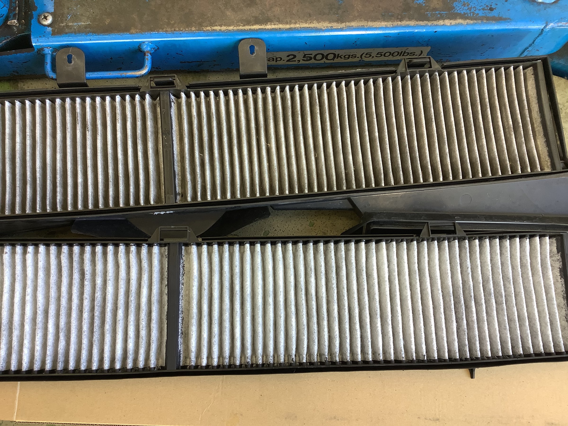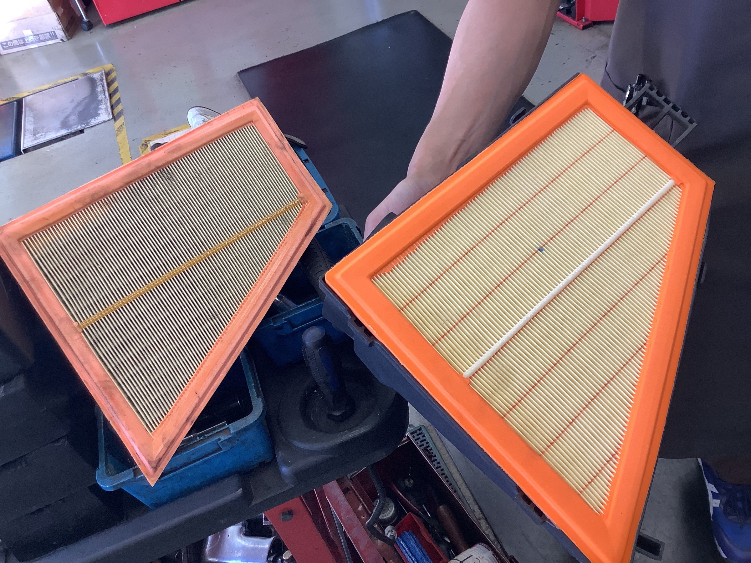 こちらはエアフィルター新旧比較、汚れも然る事ながら細かい虫のようなモノもこびり付いています。