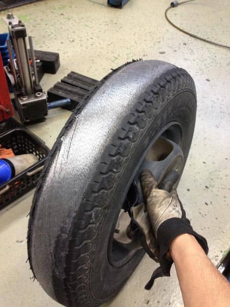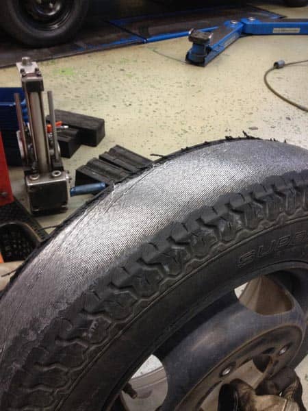 おそらく、空気圧不足での走行がかさんでしまったか、このタイヤにだけ負荷が多くかかっていたか。ともかく、大変な思いをしてきたのは間違いないタイヤです。