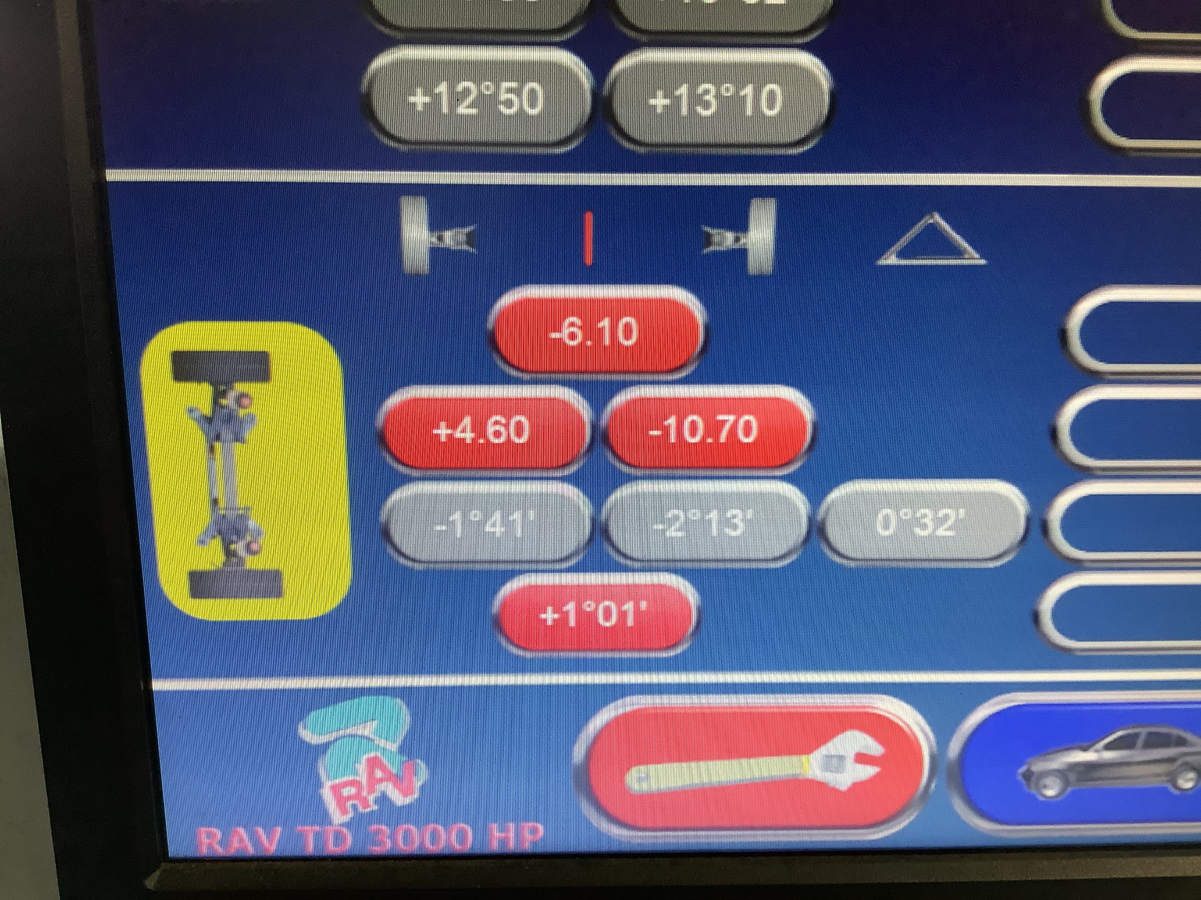 このような状態になってしまうとアライメント調整では正常値に調整すること自体難しいのですが、現状のハンドルセンターの状態をある程度改善したいというご要望でしたので、大きくトーアウトになっている右側を目いっぱい調整し(それでもアウト5mmぐらいでした)、左をほぼゼロで調整しました。