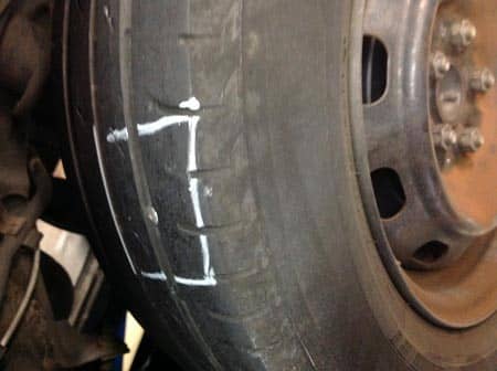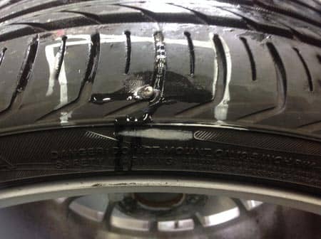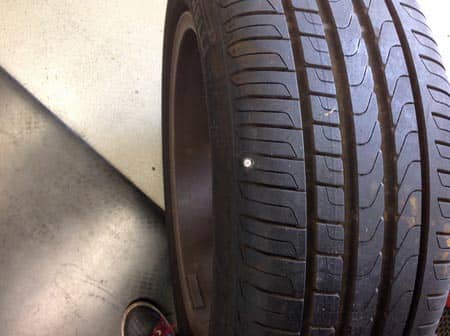 ご自身で確認していただくことも大事ですが、写真のようにタイヤの内側で目立たない場所に釘やネジが刺さっているかもしれません。