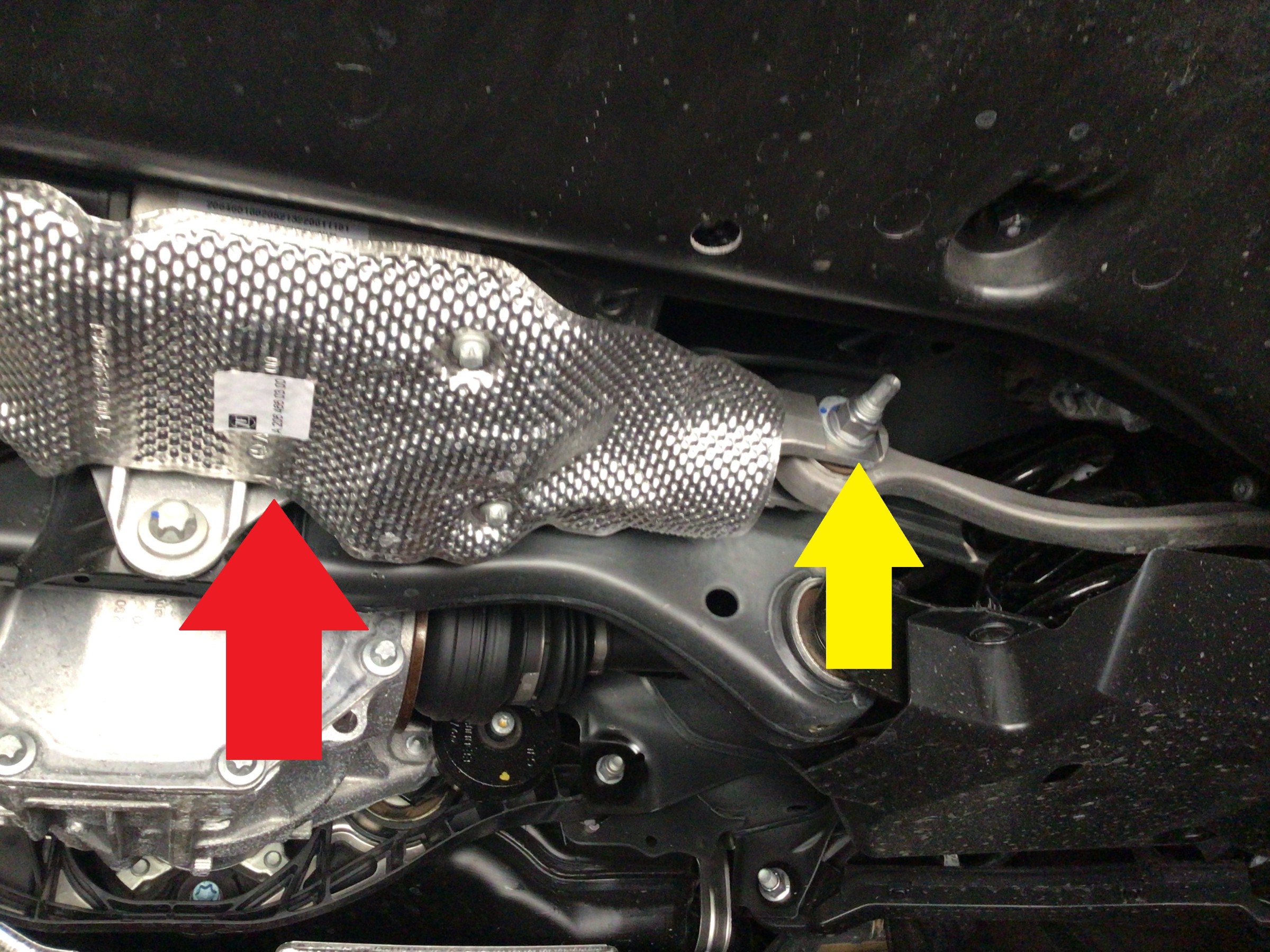 4WSになったのでリアにステアリングギアボックスが付いています。赤矢印の上、遮熱版で覆われて見えなくなっていますがここにギアボックスがあります。