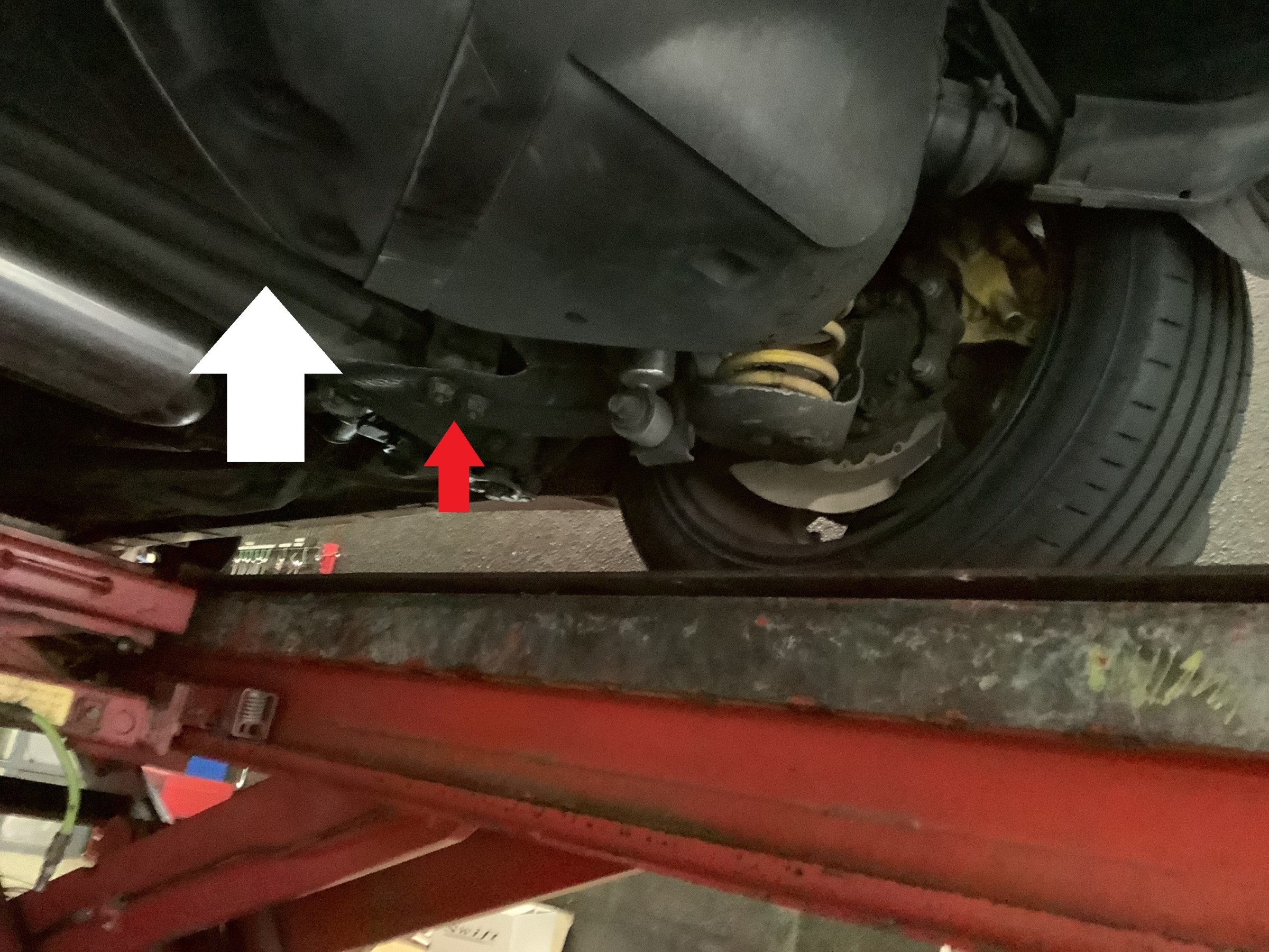赤い矢印のボルトナットを緩めて、白い矢印のところにあるトランスバースアームを動かして調整するのですが、こちらもガタ調整ですのでプライバー等を使って動かして調整します。