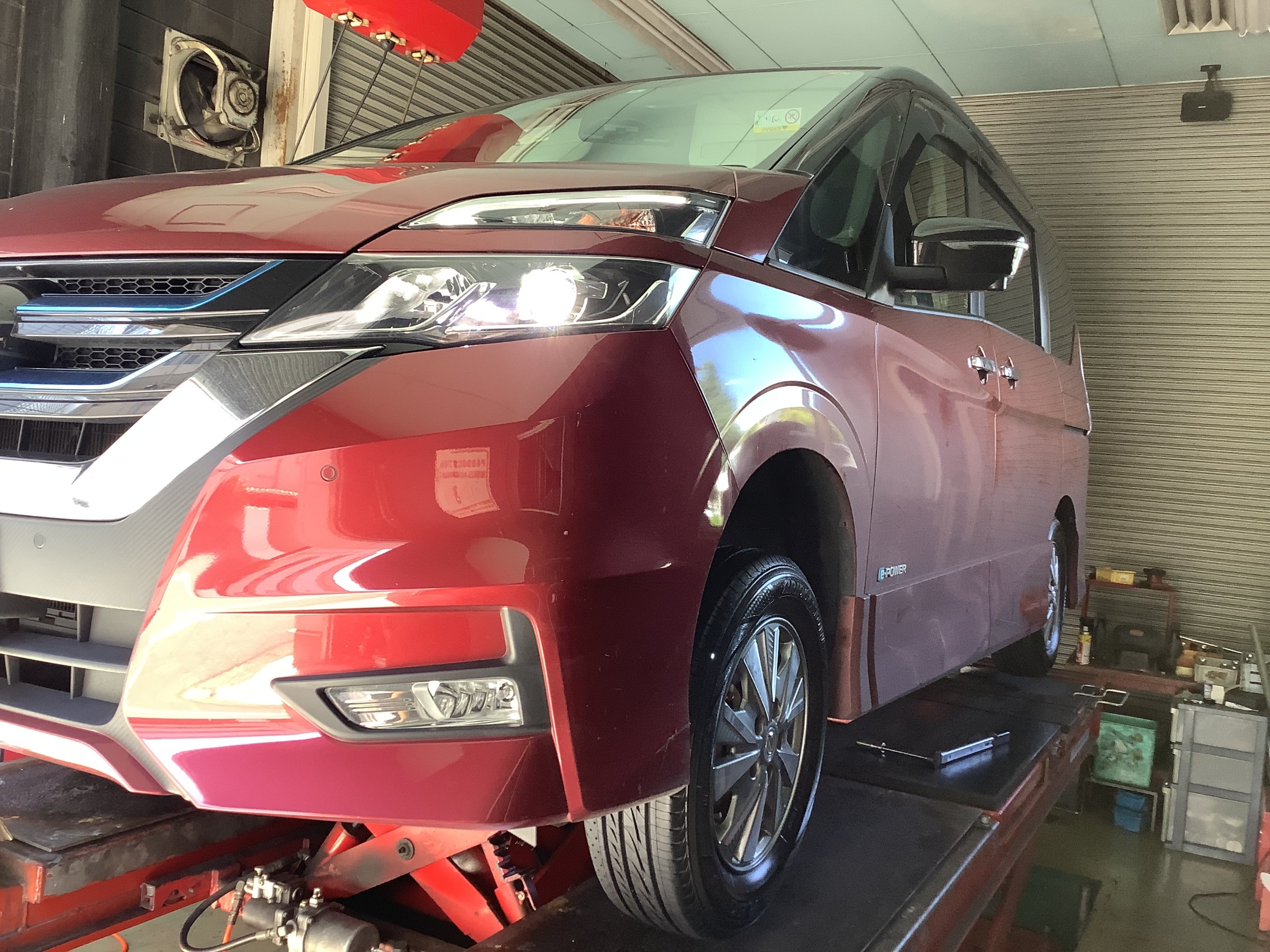 出先でバーストされたセレナ、そのままレッカー移動にてご来店。