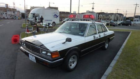 写真1・・・初お披露目となった230セドリック激突横転炎上爆破黒パト仕様。 残念ながら声を掛けてくれるのは当時若者だったオジサンか、某刑事ドラマで感化された人ばかりです(笑)