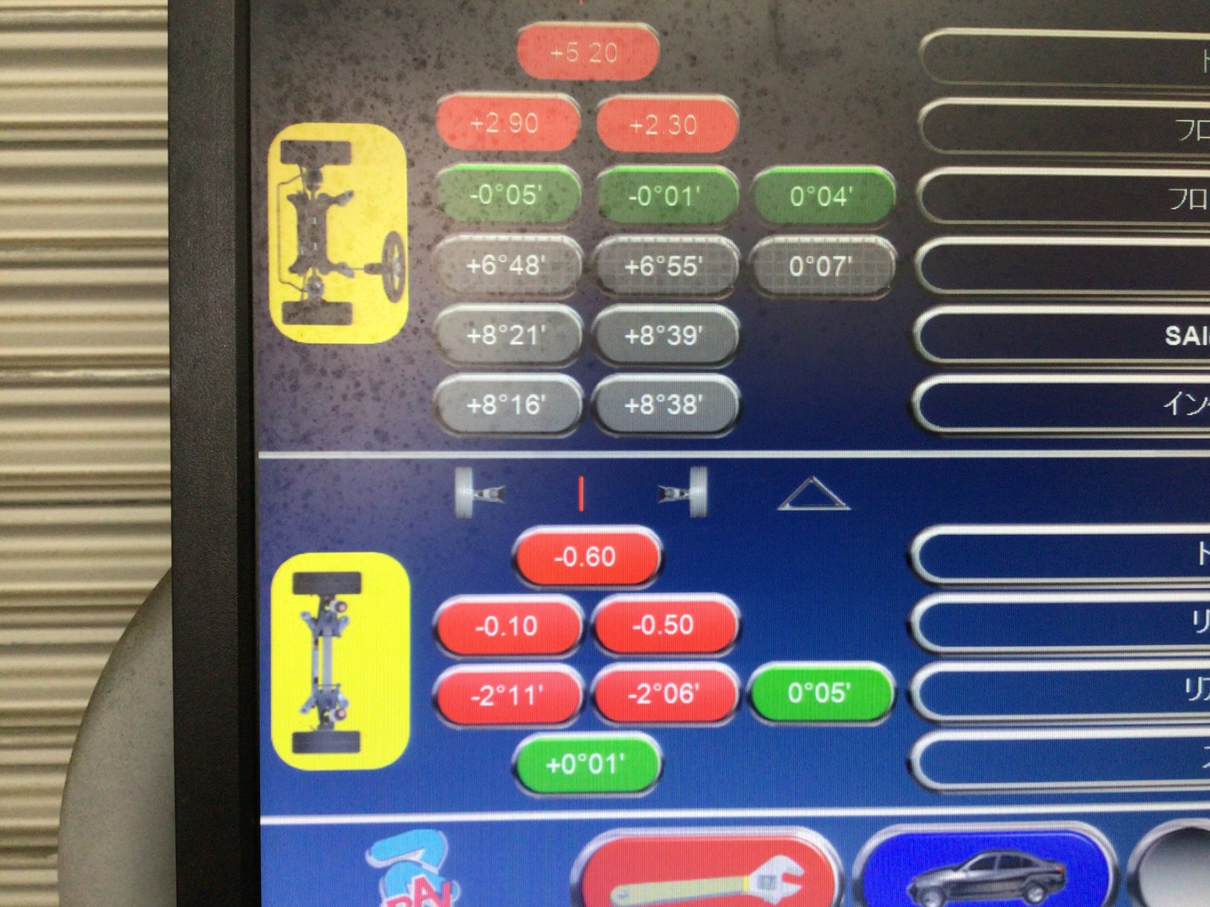 リアキャンバーがネガティブ過大、リアトーはトーアウト、フロントはトーイン過大となっていました。