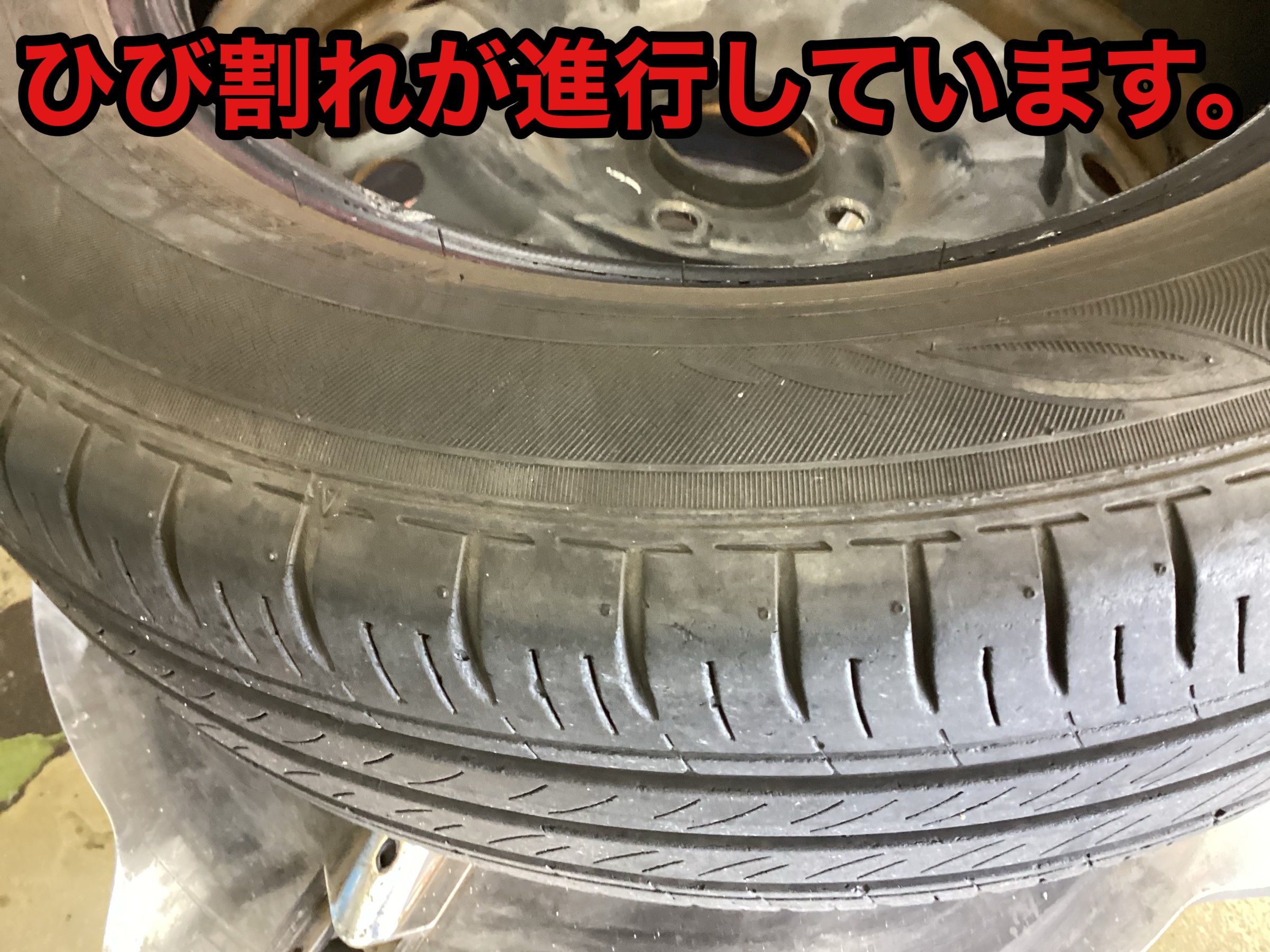 取り外したタイヤを確認すると、全体的に経年劣化によるひび割れが散見されました。