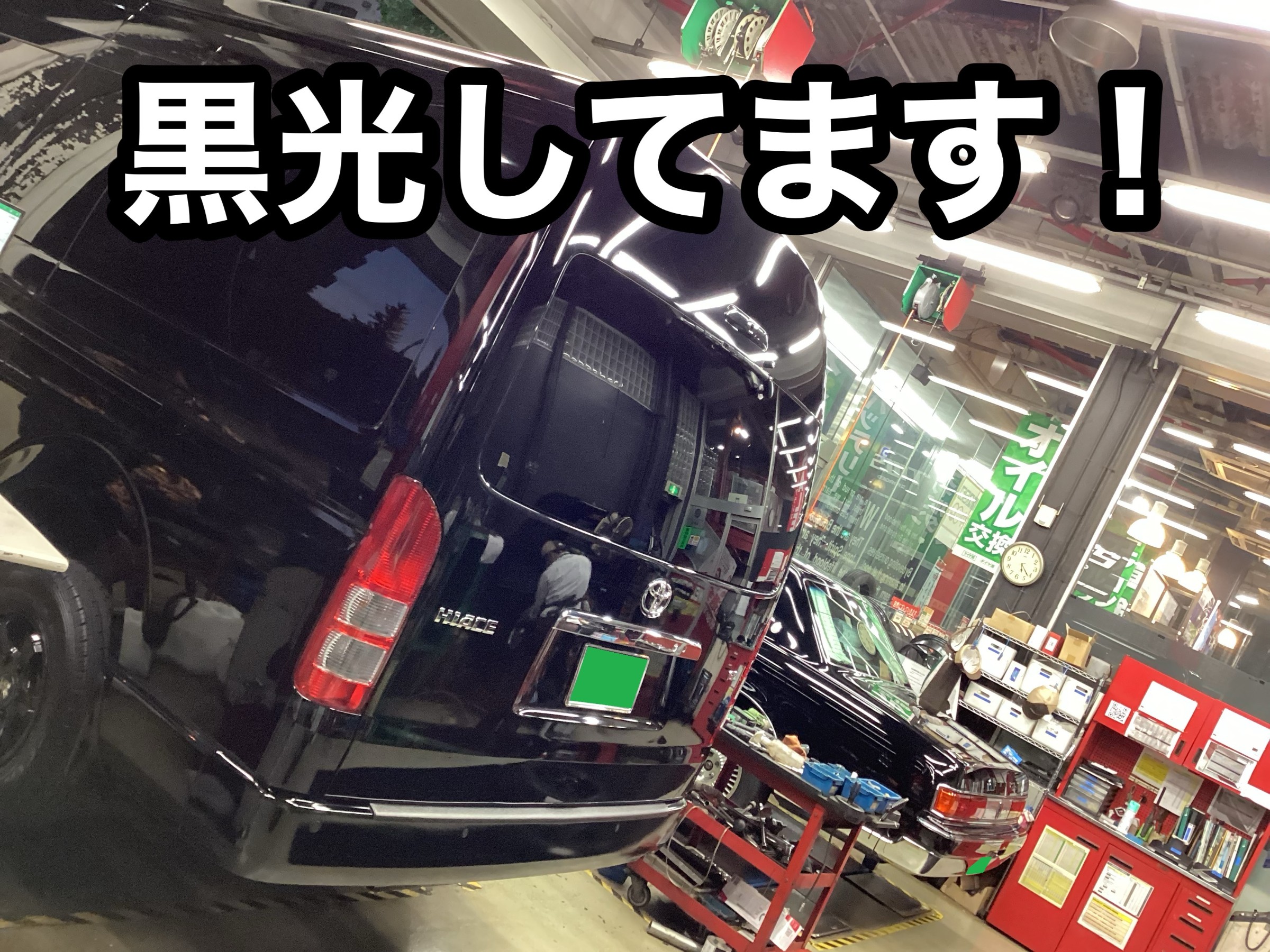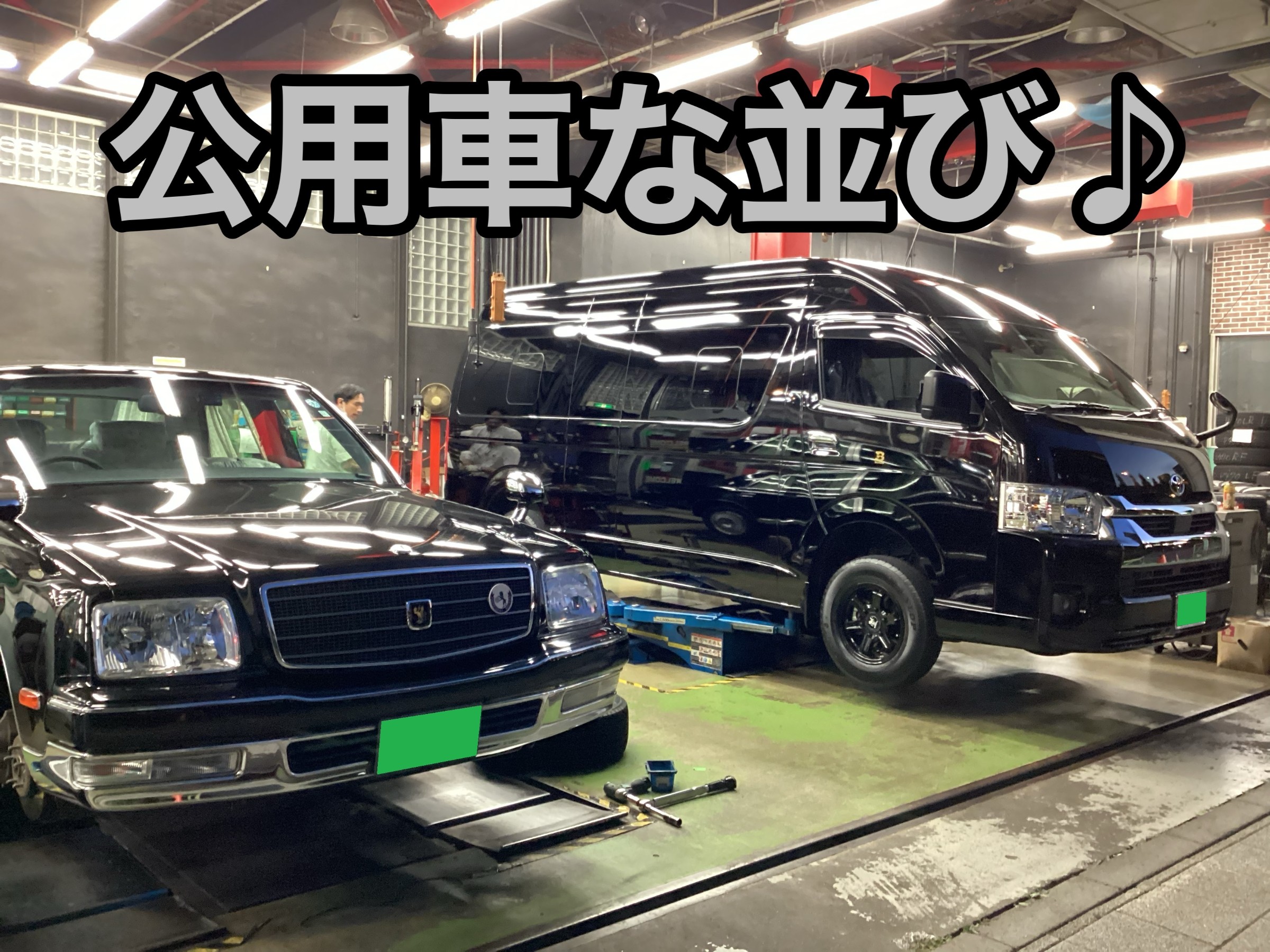 偶然黒塗りのハイエースと同時入庫だったので、あたかも政治家の車列のような見た目になりました(笑)