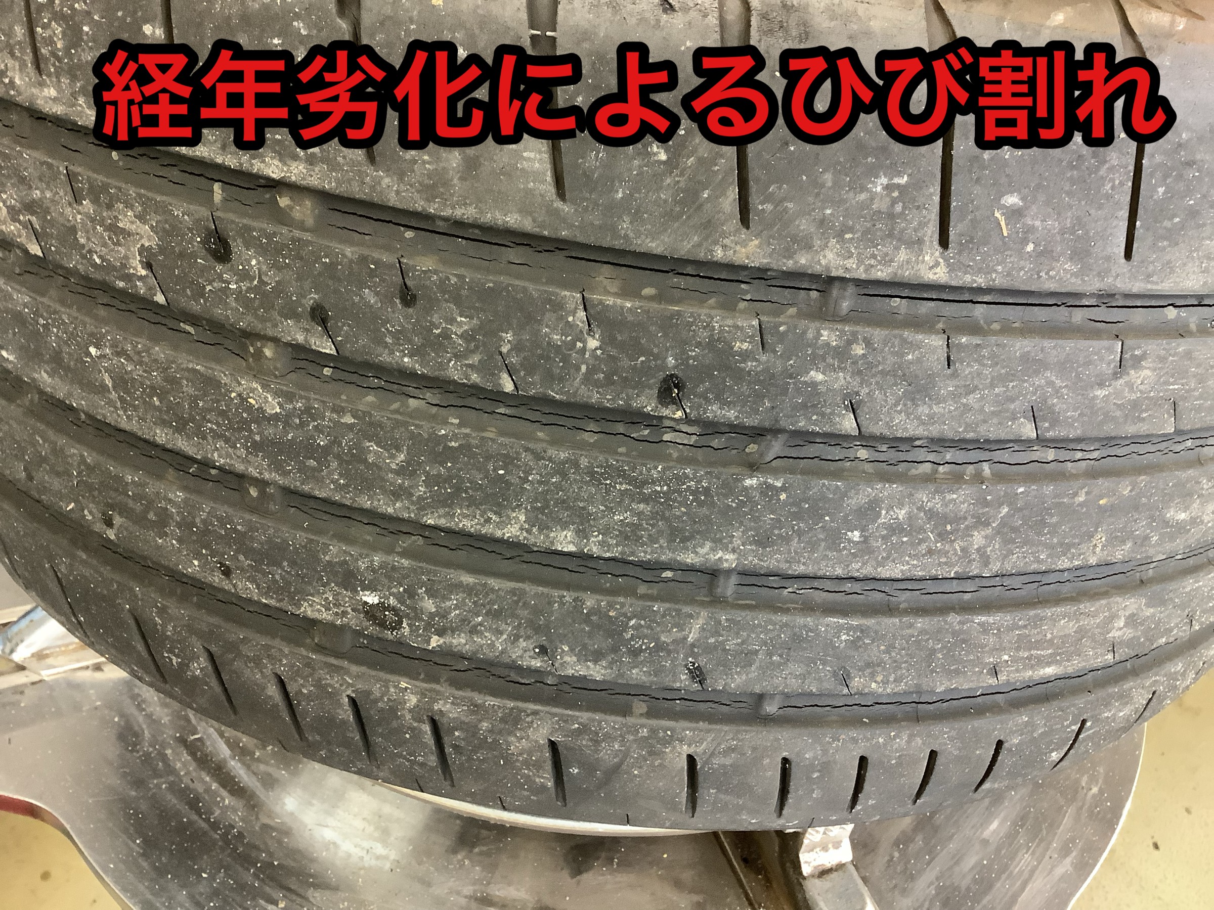 交換前のタイヤは経年劣化でひび割れを起こしており、しかも見えにくい場所なので危ないところでした。