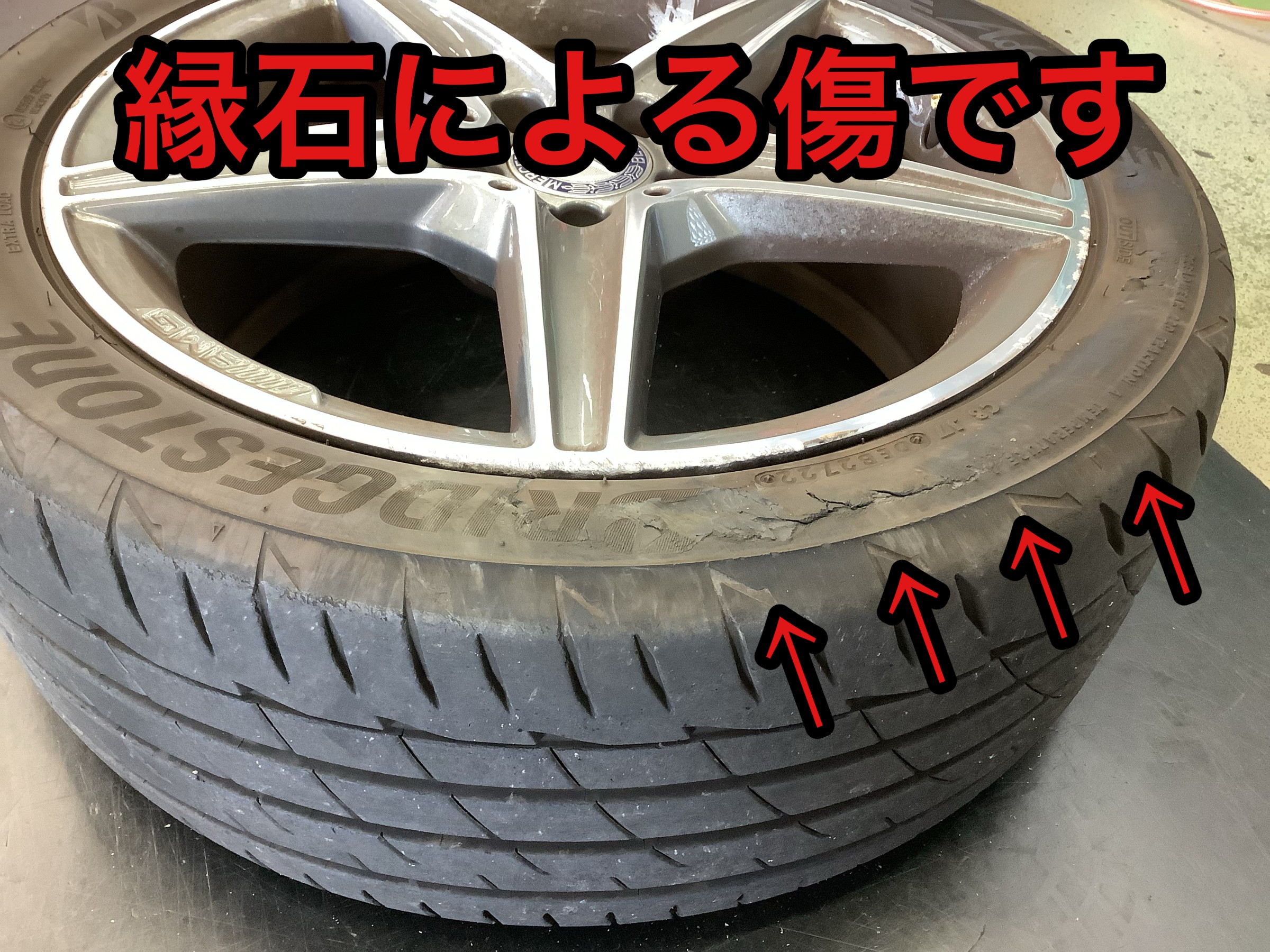 タイヤを確認するとサイドウォールが損傷しておりかなり危険な状態です。