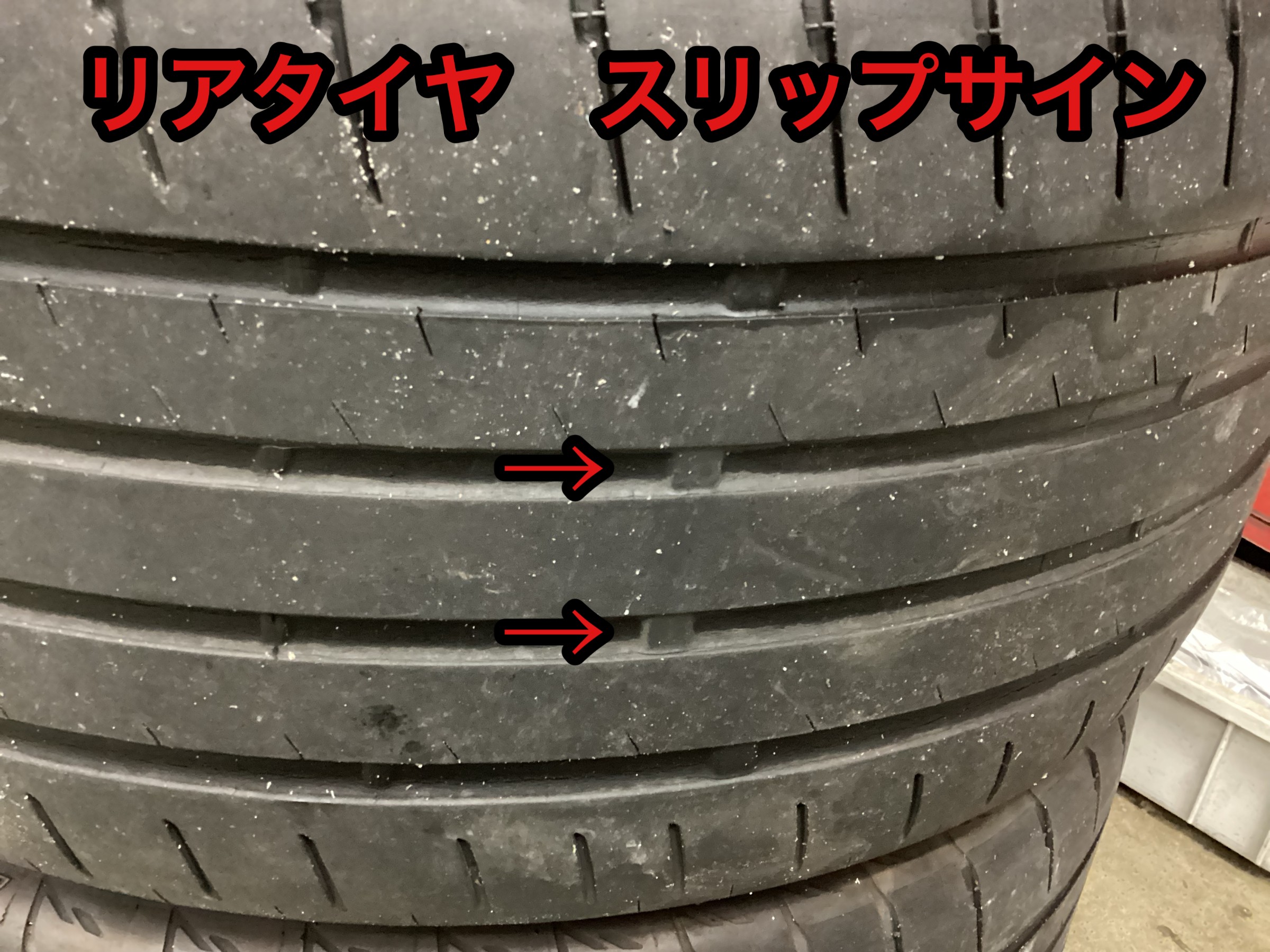 元々交換予定だったリアタイヤはスリップサインギリギリの状態でした。