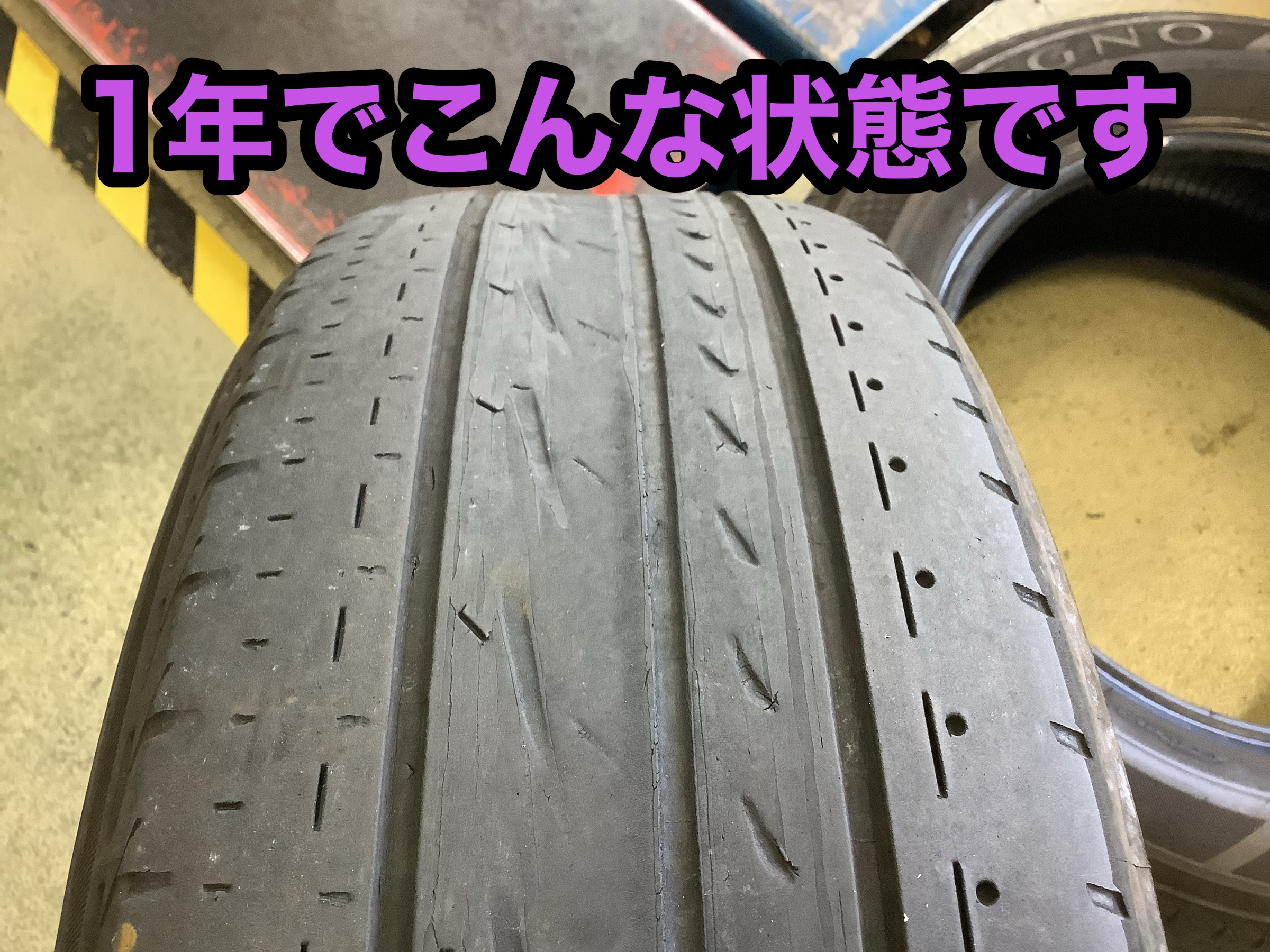 装着しているタイヤは23年製なのですが、距離を走られるお客様なのでかような状態に・・・。