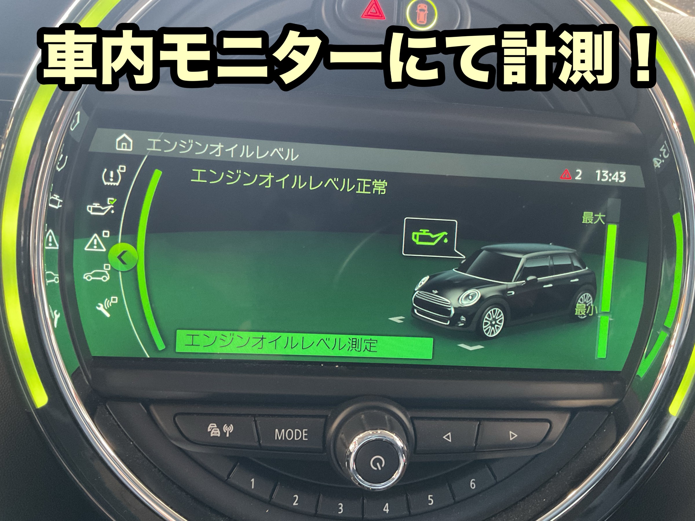 オイルレベルゲージは付いていますが、車内モニターで確認です。