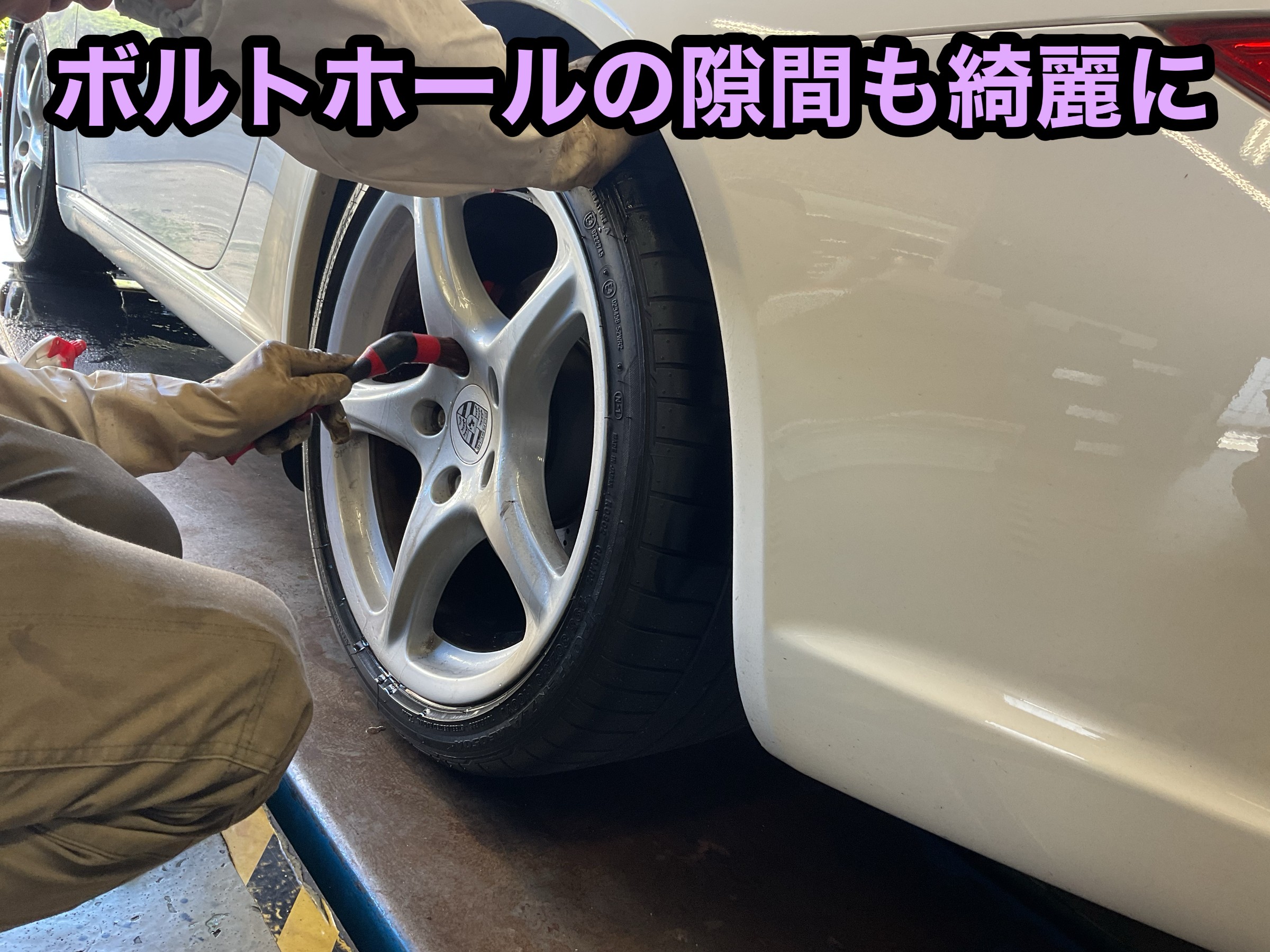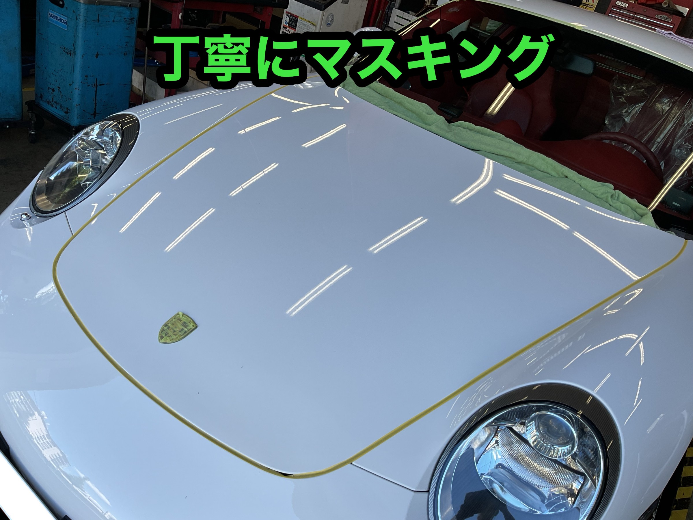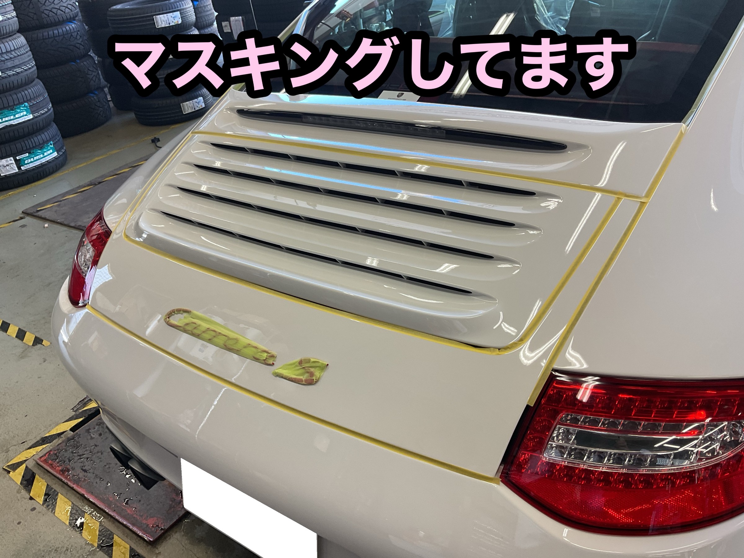 洗車が終わると磨きの下準備であるマスキングをしていきます。