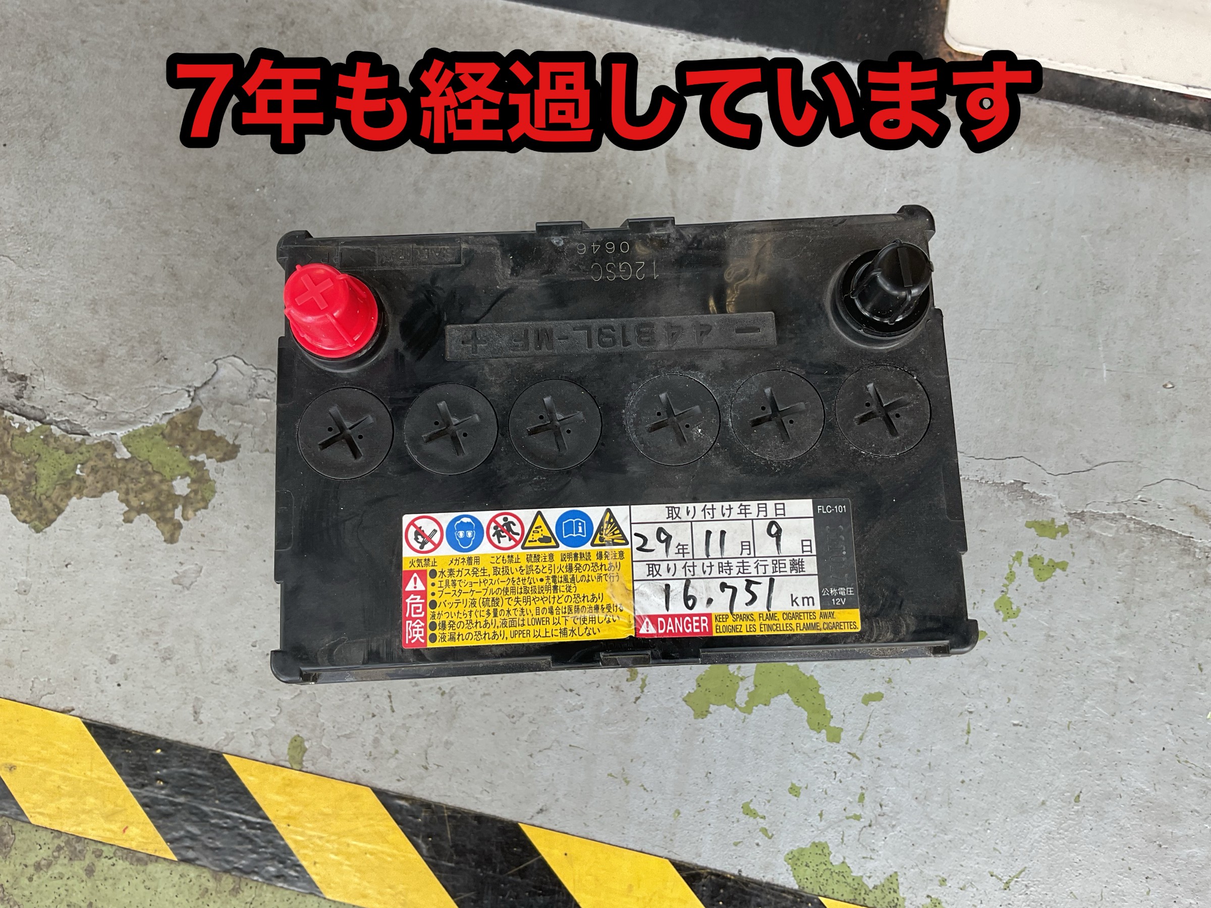 無料安全点検も同時に行い、装着されていたバッテリーがこちらもまさかの7年前のもの。