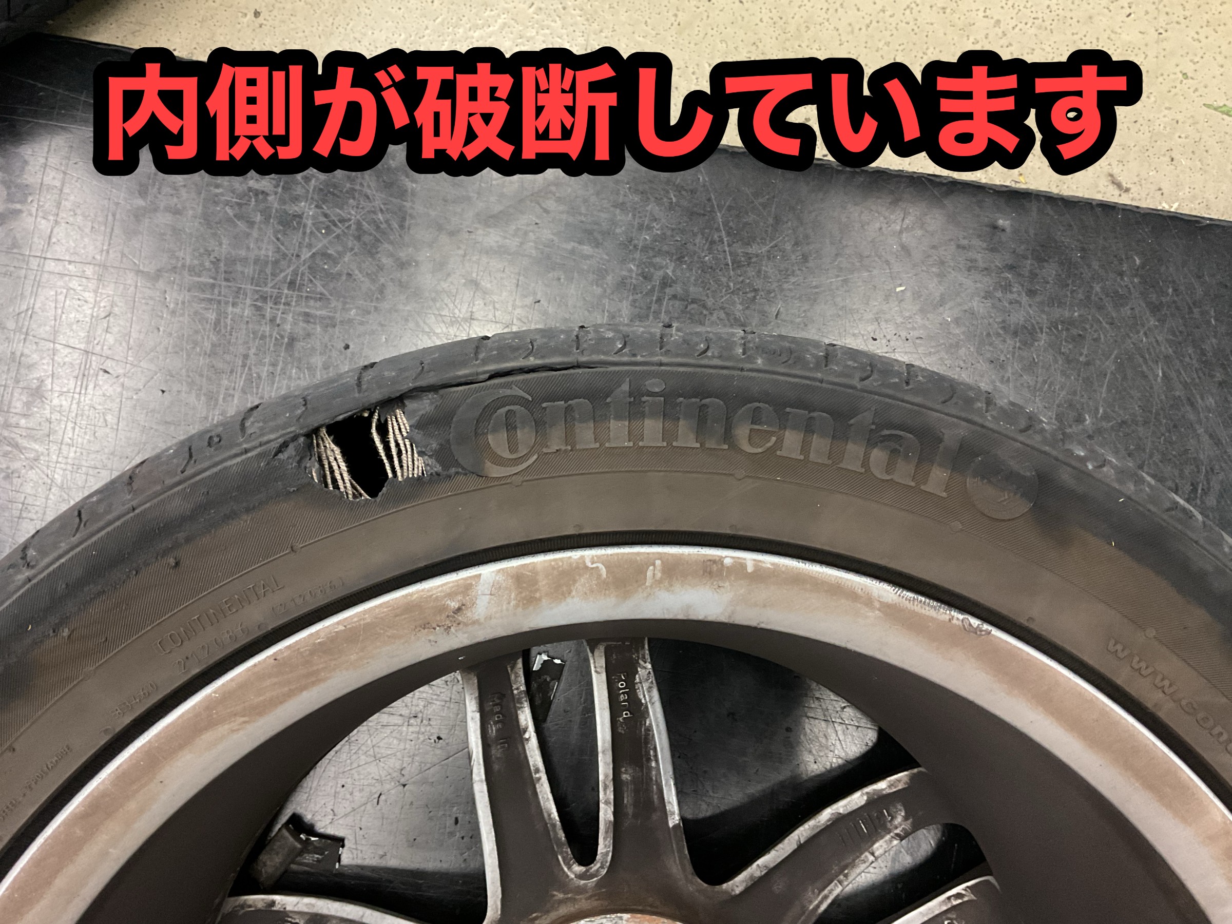 お話を伺うとタイヤをパンクされたとの事、確認すると内側に損傷が・・・。