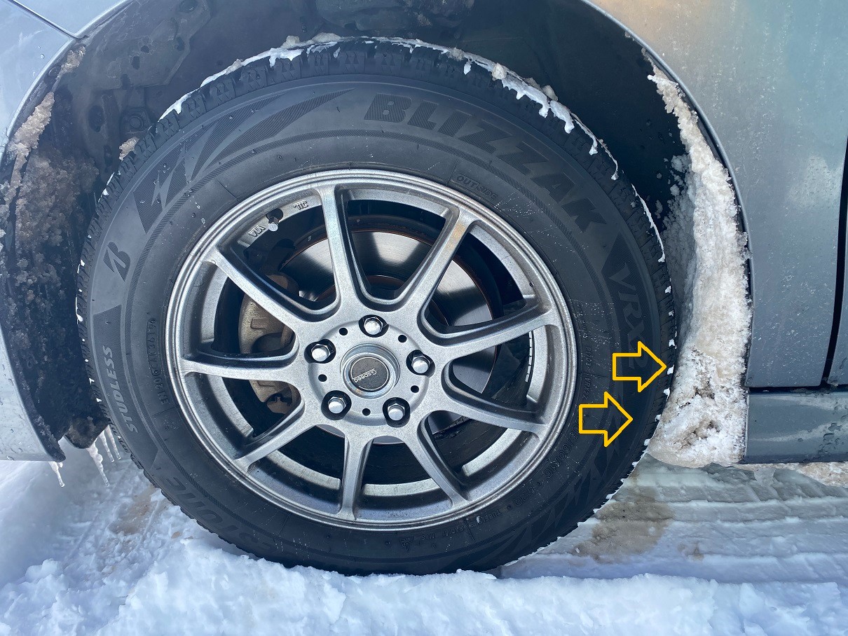 ゲレンデに着くと、タイヤとボディの間にも雪がたまっています。その隙間5mm程度。