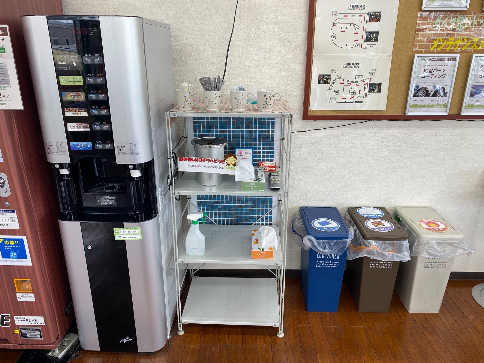 ☆お客様アンケート改善報告☆ ポスト 2025年5月8日 当店3階のウエイティングルーム 作業待ちの間に快適に過ごしたい。 ドリンクコーナーのものがわかりにくいなどのお声を頂き改善致しました。 自動販売機の隣にある給茶機&コーヒーのメーカーですが、隣の棚に砂糖やガムシロップ、マドラーなど ご用意をしてあります。 飲み残しのドリンク入れやティッシュなどわかりにくかったかと思いますので 整理を致しました。 皆様の貴重なお時間を快適に過ごして頂けるよう、当店も 常に改善を続けてまいりますのでお気づきの点がございましたら スタッフまでお気軽にお声掛けください。 タイヤ館 パドック246 住所:158-0097東京都世田谷区用賀1-17-10 電話番号: 03-3700-1080 カテゴリ:お知らせ その他 その他商品・サービス