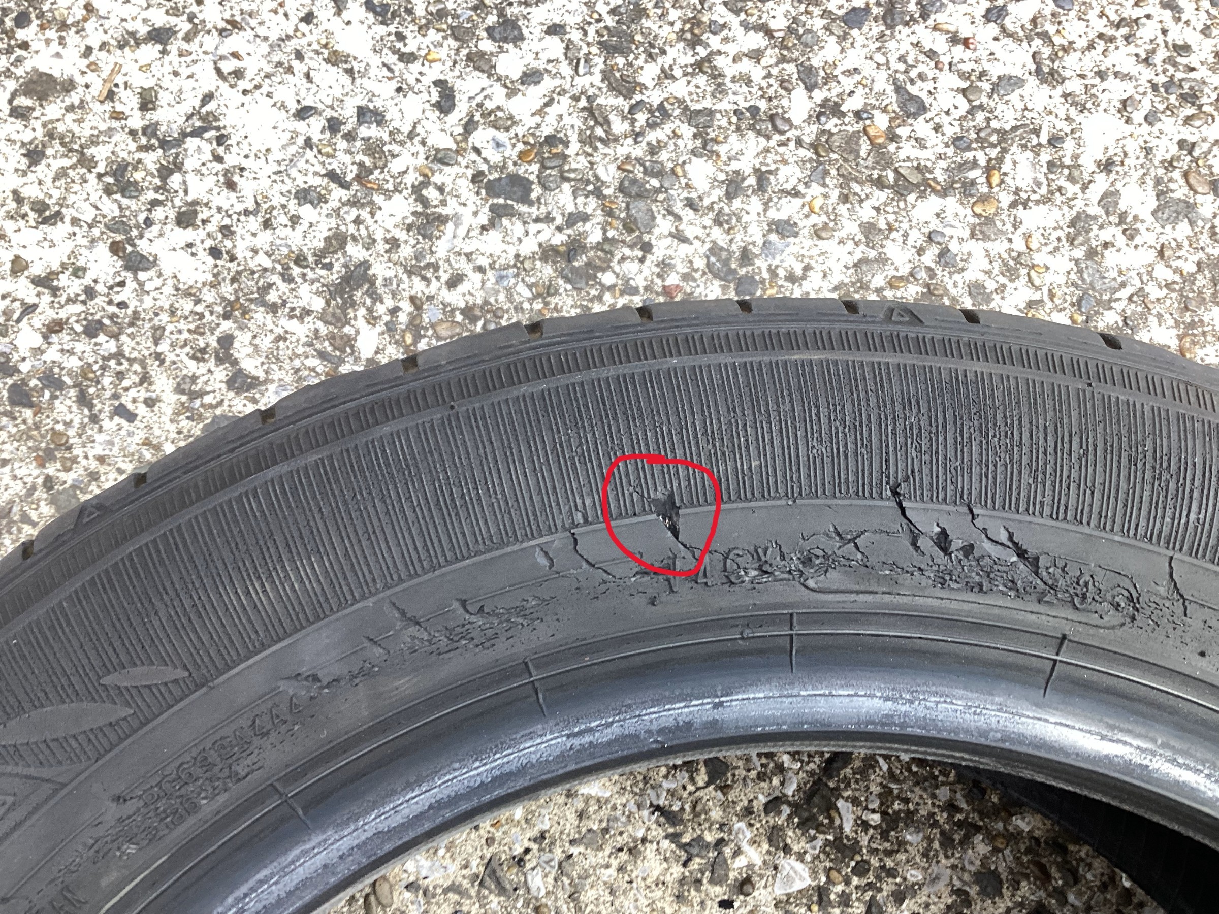 タイヤサイド部の赤〇部がカットにより中のコードが見えてしまっています。